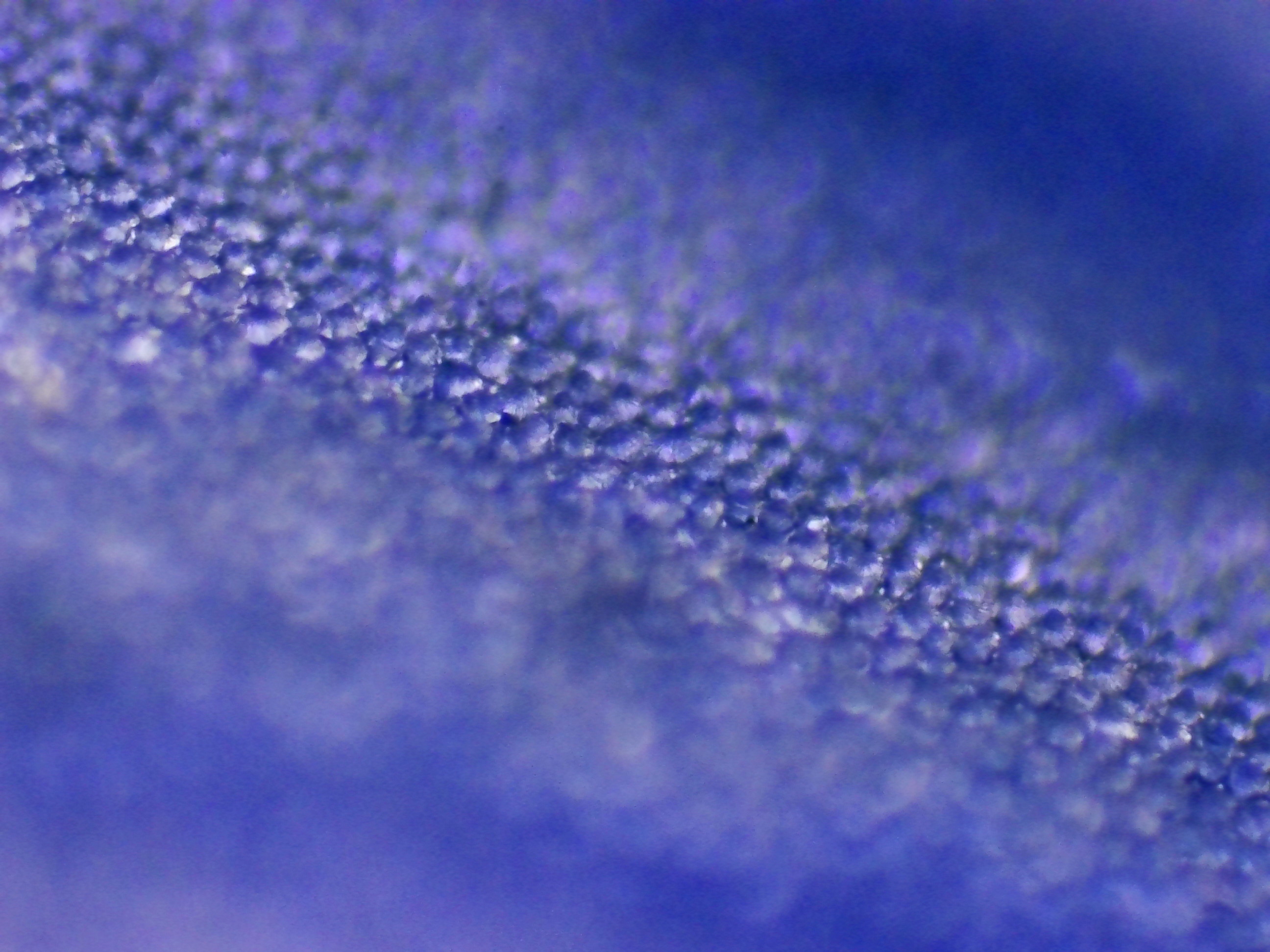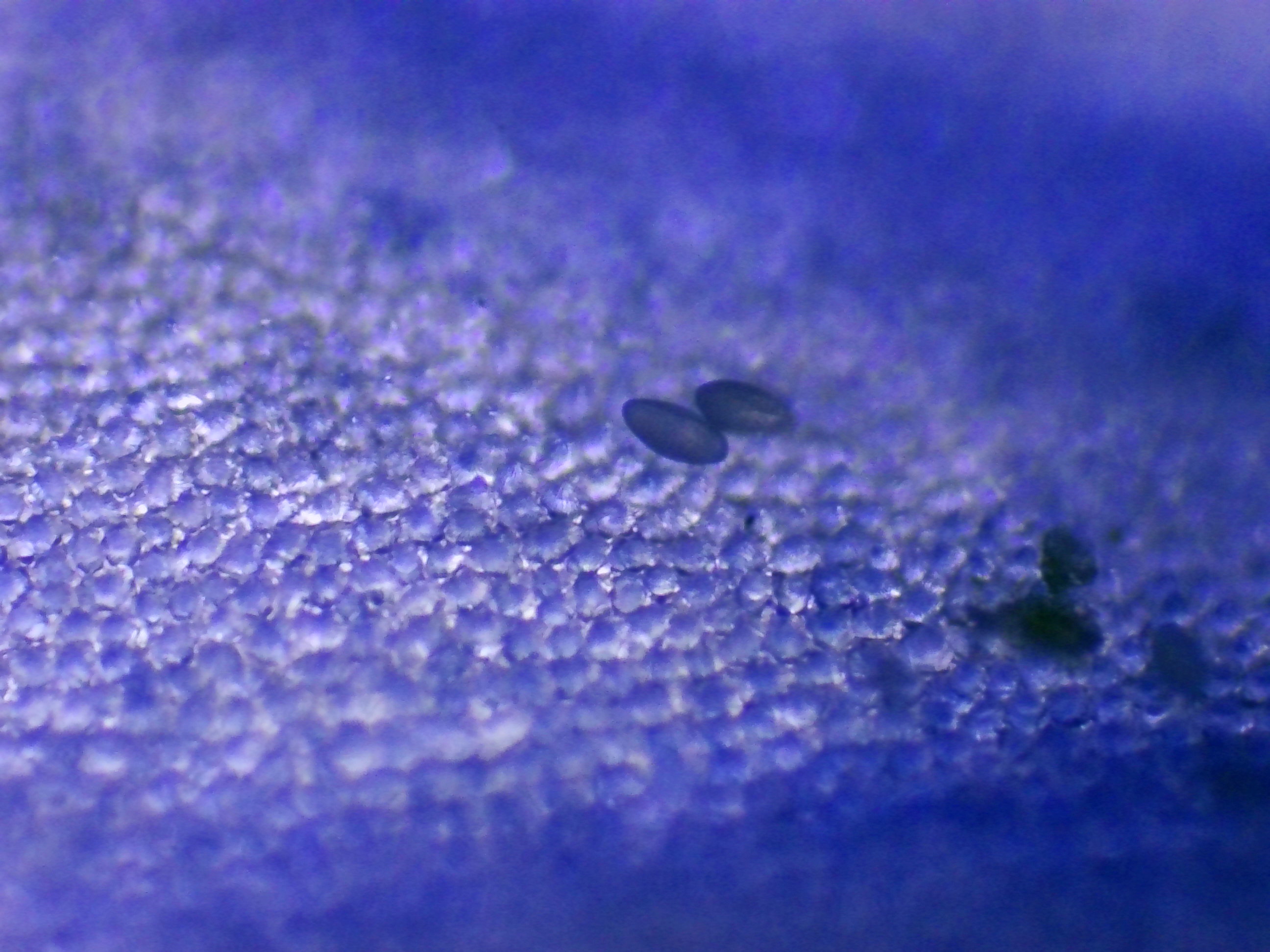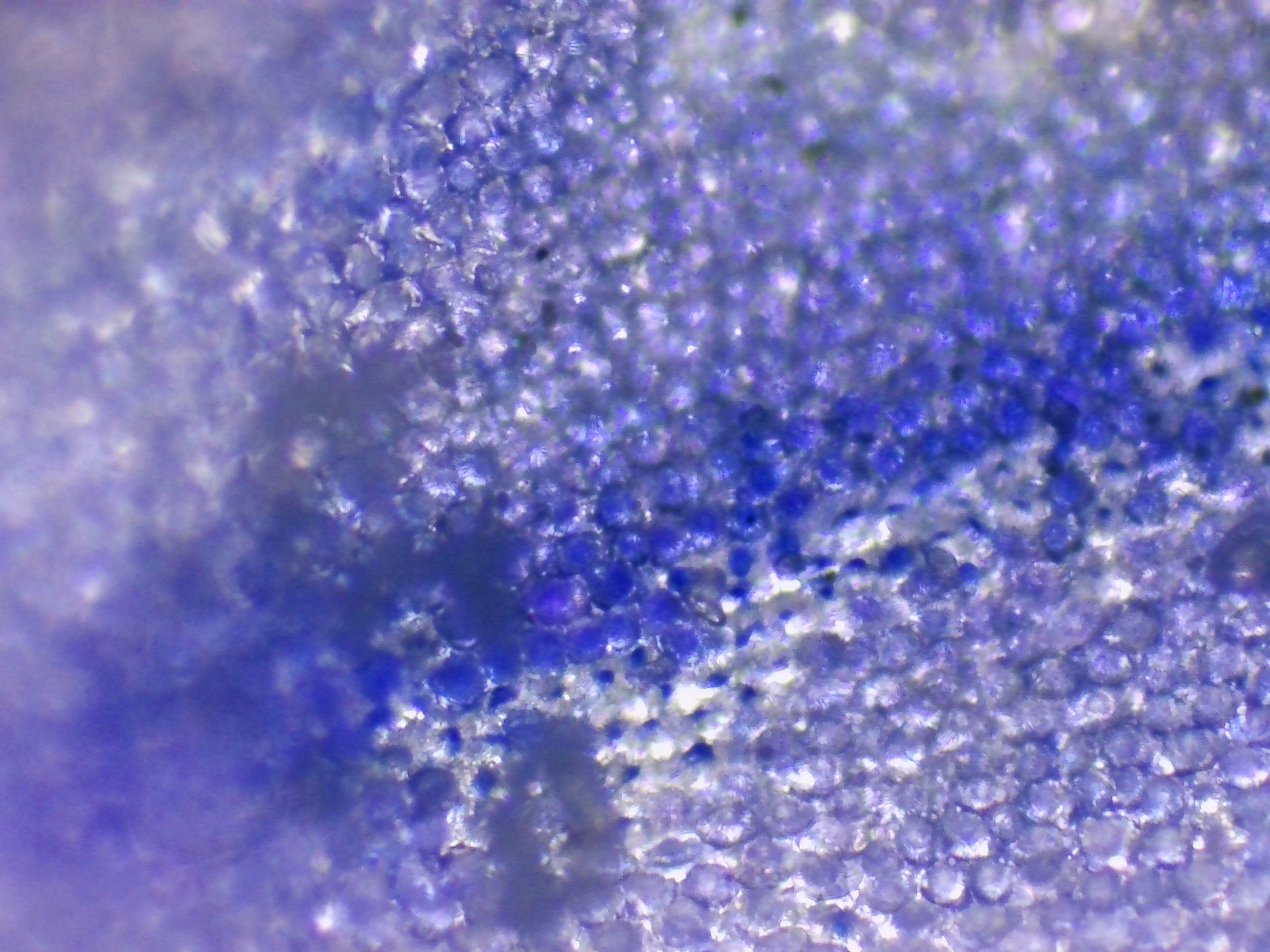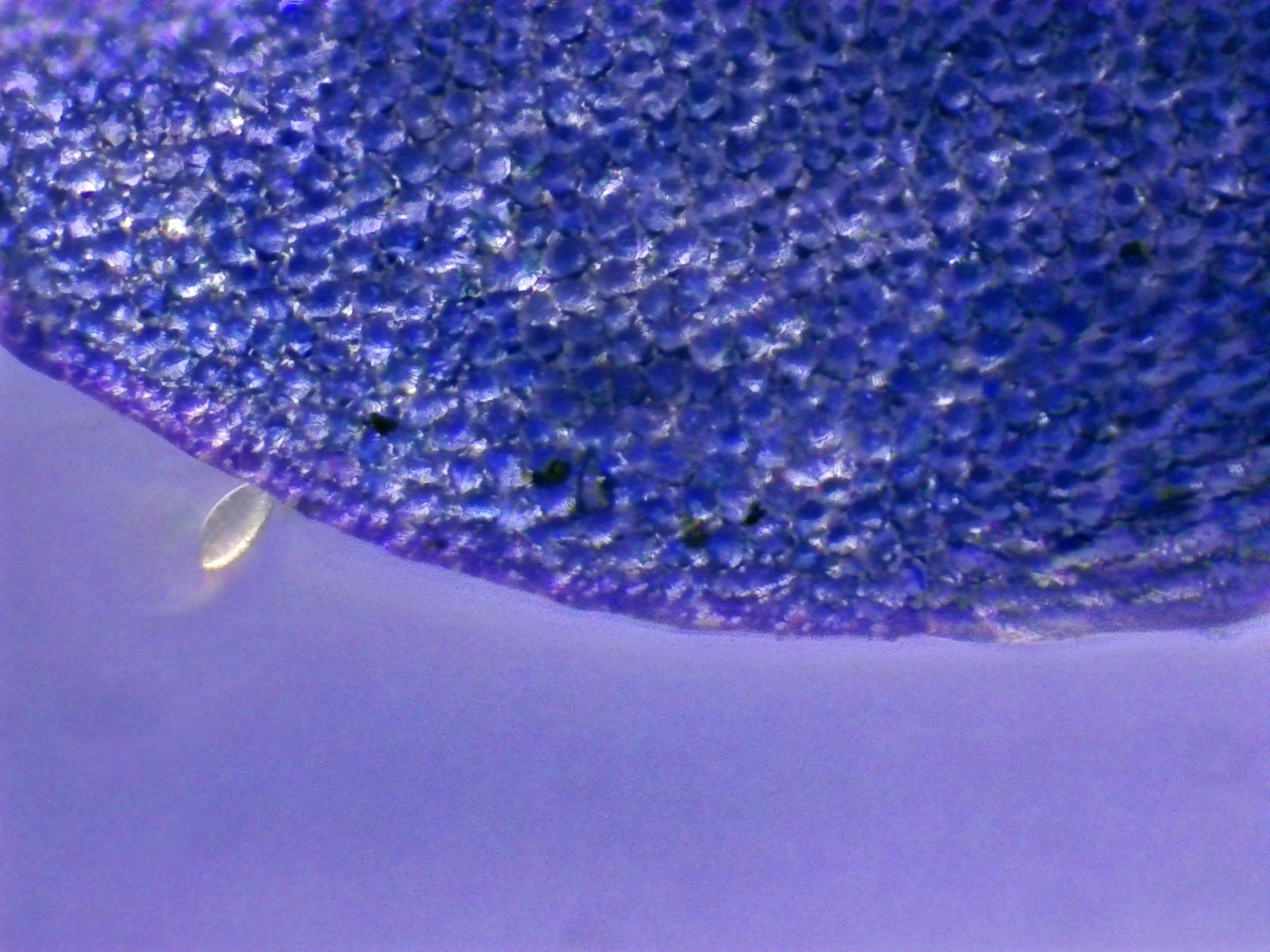 Sur ces deux photos, j'ai cherché à mettre en évidence des changements dans la pigmentation du pétale. On voit clairement ici la forte amplitude de concentration en pigments d'une cellule à l'autre, alors même qu'elles sont voisines : certaines sont presque transparentes, tandis que les autres peuvent être d'un bleu particulièrement profond.