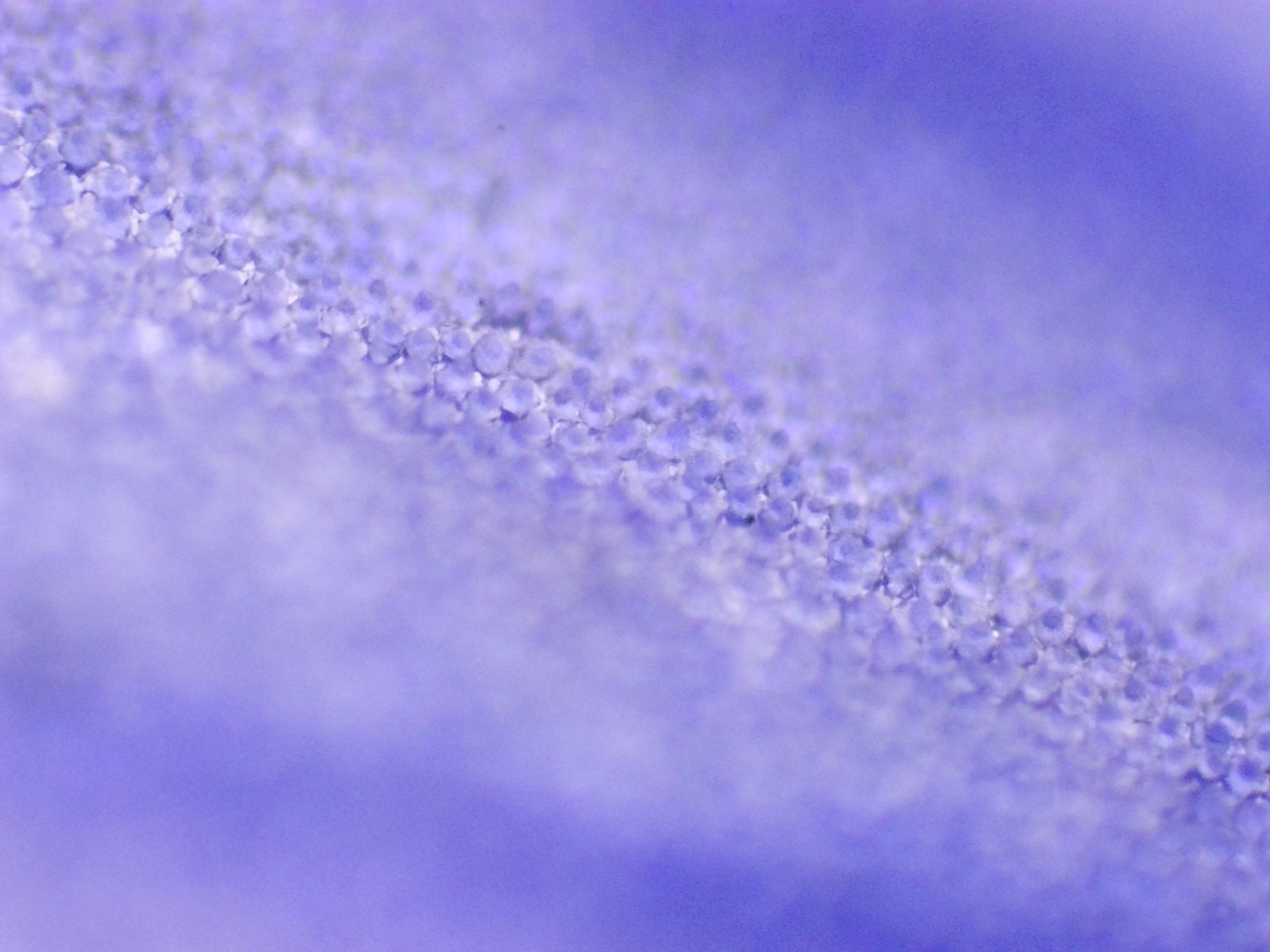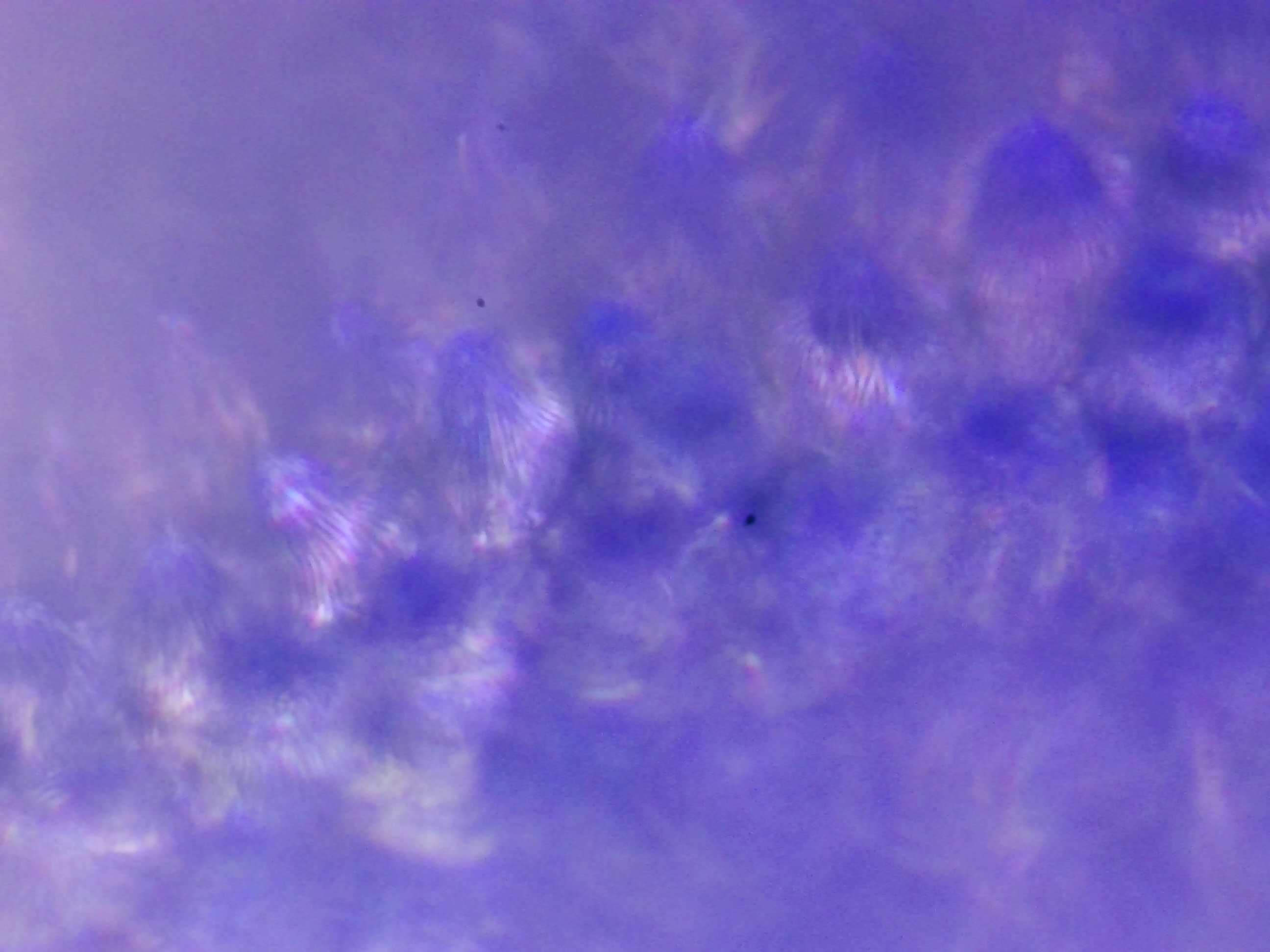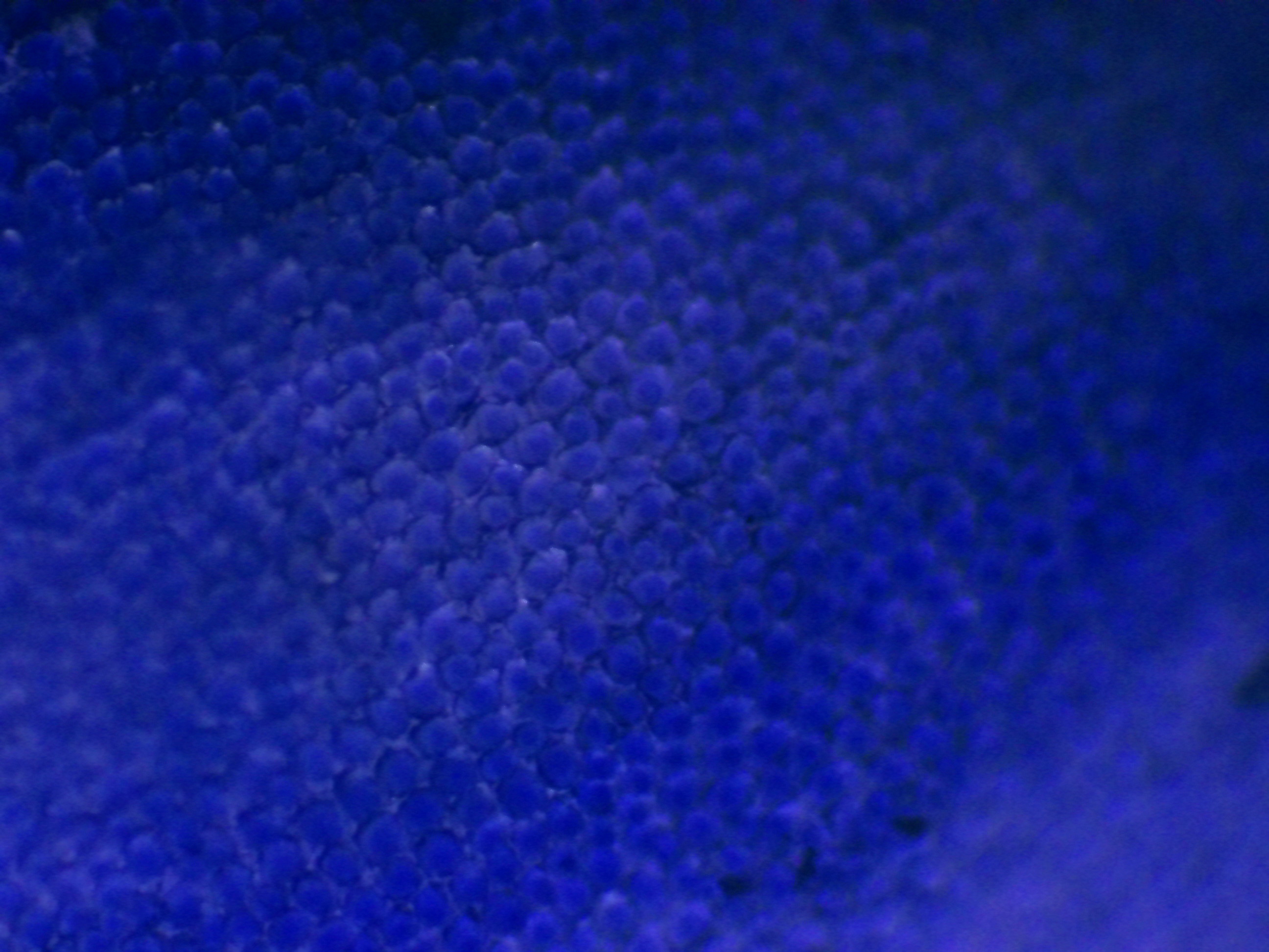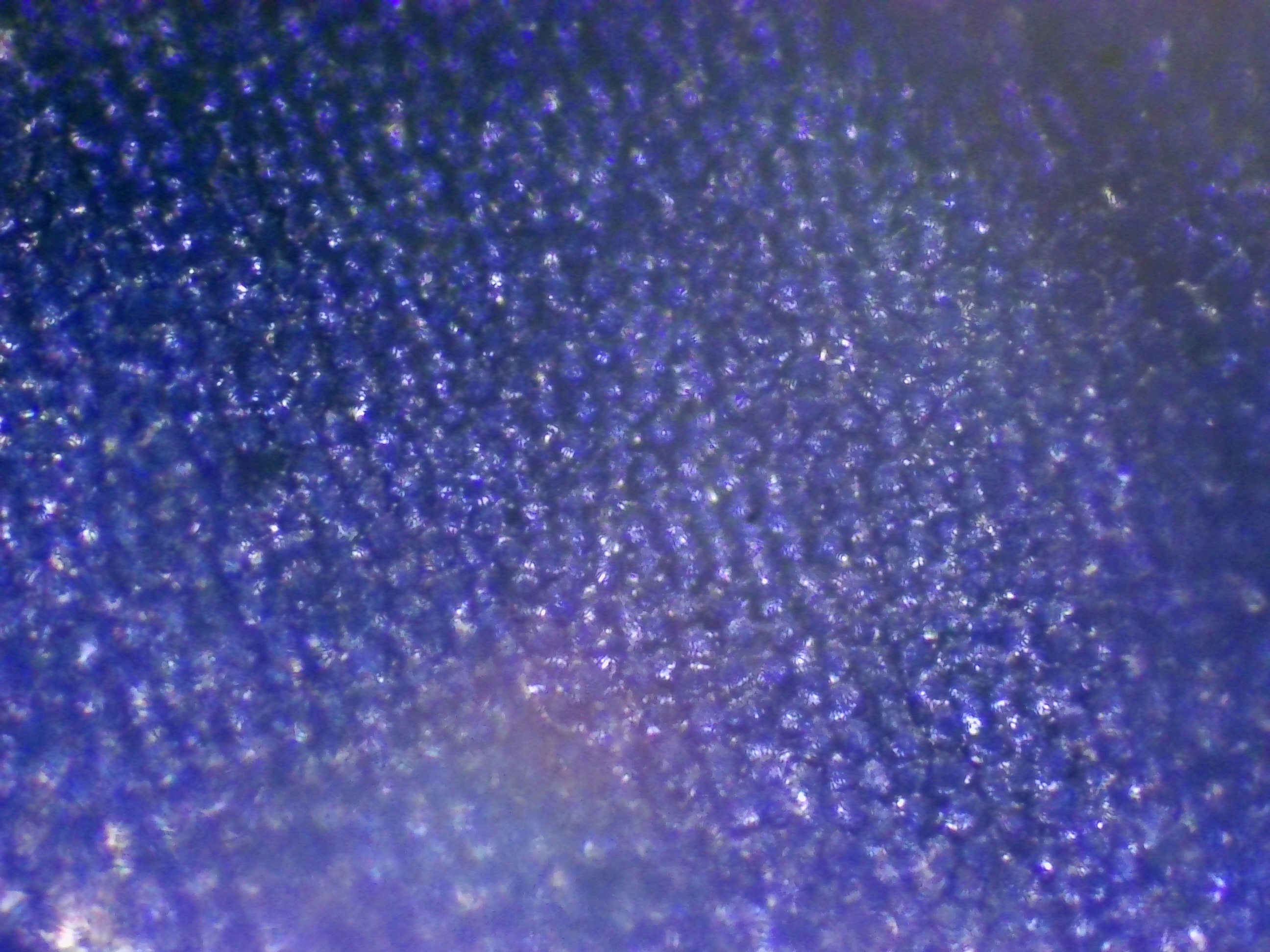 Sur ces deux photos, j'ai cherché à mettre en évidence des changements dans la pigmentation du pétale. On voit clairement ici la forte amplitude de concentration en pigments d'une cellule à l'autre, alors même qu'elles sont voisines : certaines sont presque transparentes, tandis que les autres peuvent être d'un bleu particulièrement profond.