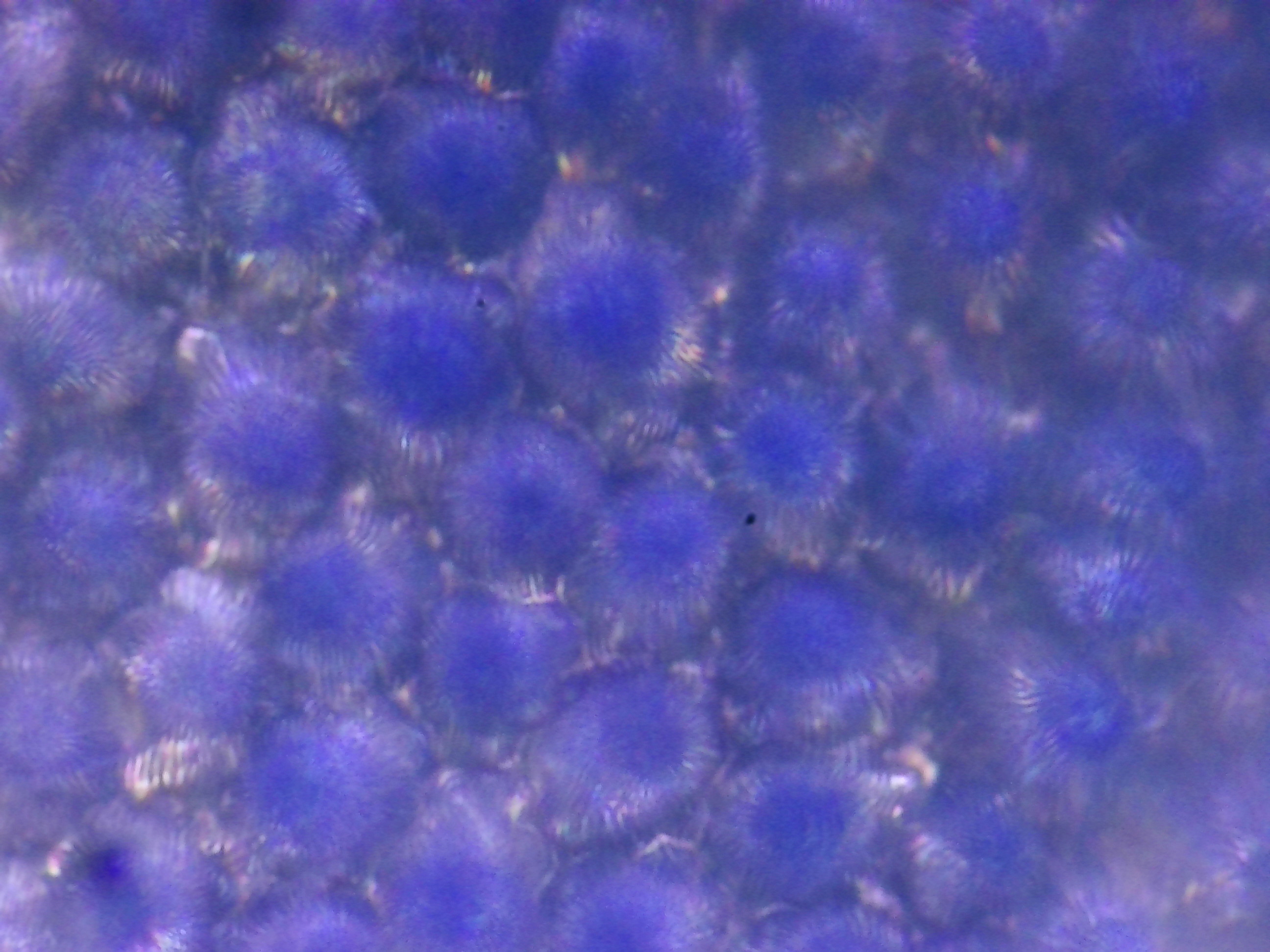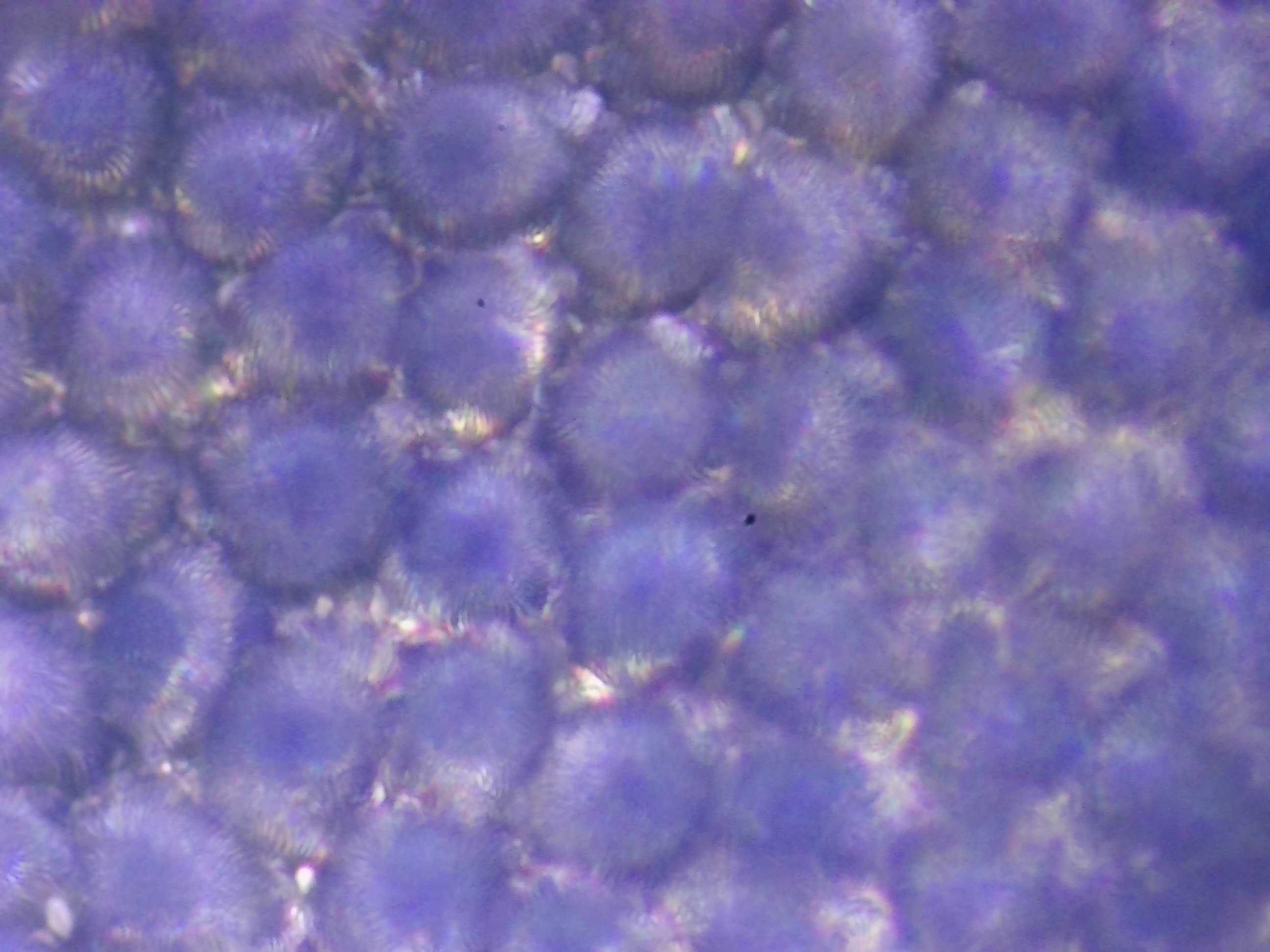 Ces premières observations ont été faites naïvement, sans technique particulière, dans un milieu sec. Cette remarque explique la faible profondeur de champ, matérialisée par les bandes floues à mesure que l'on s'éloigne du centre de la photo. Si j'avais employé un milieu approprié et recouvert la préparation avec une lamelle, l'échantillon aurait été plat, m'offrant une profondeur de champ plus uniforme.
