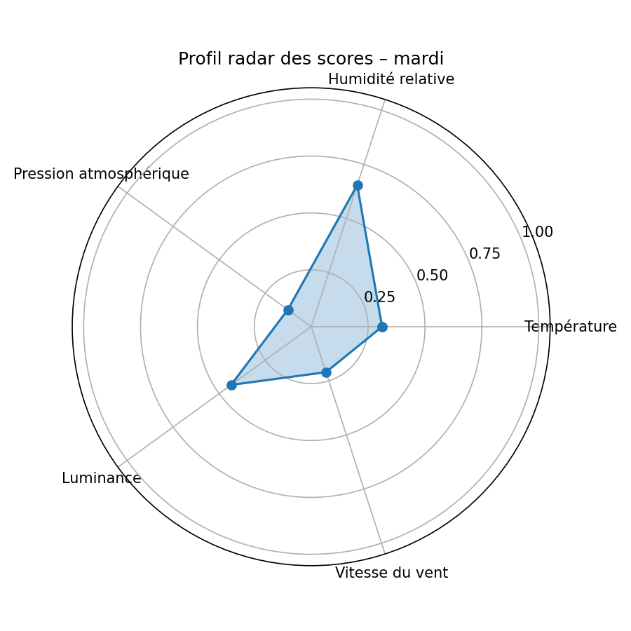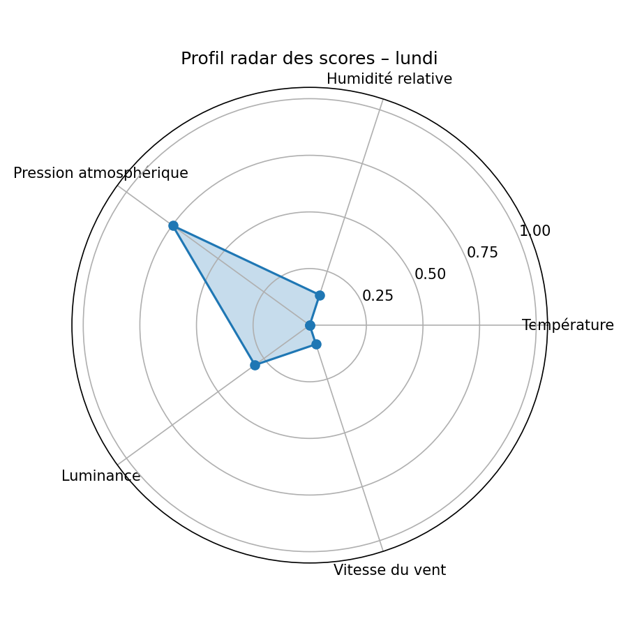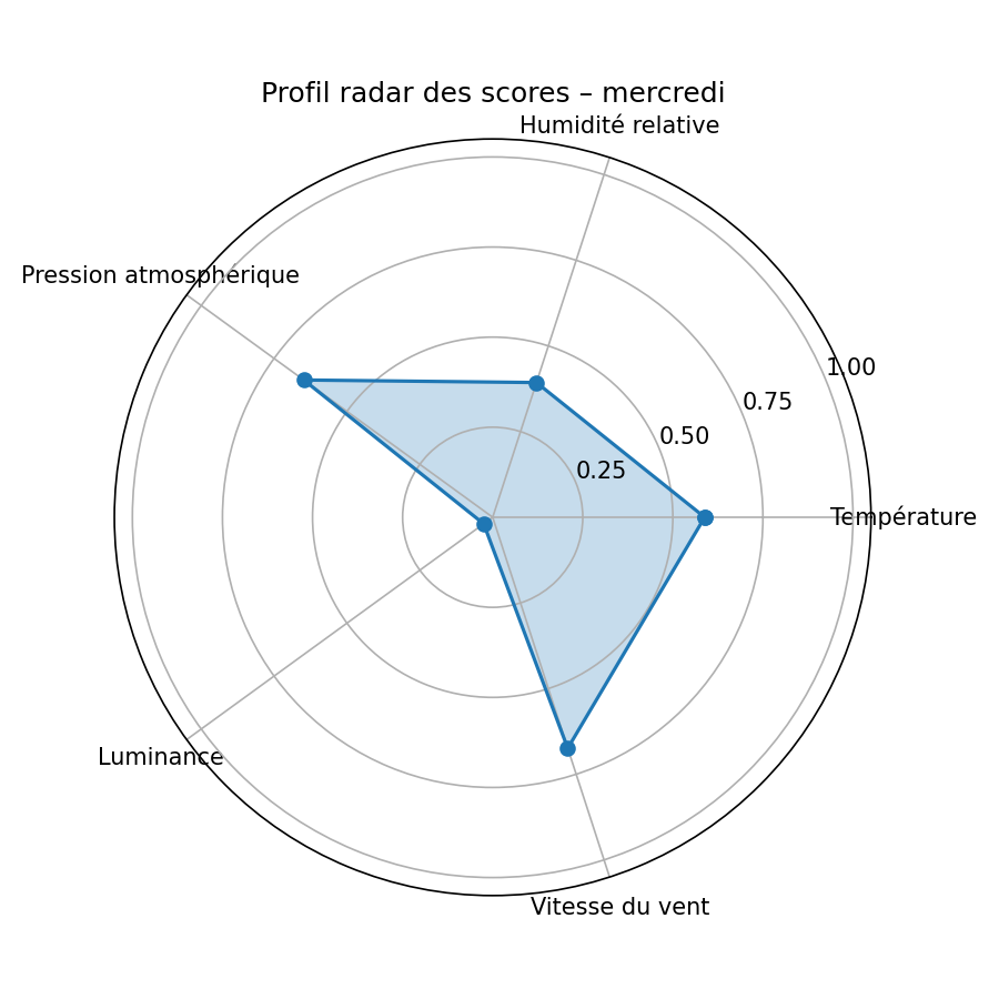 calcule les moyennes de température, d’humidité, de pression atmosphérique, de luminance et de vitesse du vent pour chaque jour de la semaine, puis normalise ces valeurs pour attribuer un score de « confort » entre 0 et 1 à chaque jour : plus chaud et lumineux, moins humide et moins venteux, et une pression jugée « confortable » quand elle reste proche des valeurs habituelles plutôt qu’en situation très basse ou très élevée. Il produit d’abord le profil moyen par jour de semaine ci‑dessous, puis un graphique de score global qui met en évidence le jour objectivement le plus favorable selon ces critères. Enfin, une petite série de graphiques radar montre, pour chaque jour, comment se répartissent les scores des différentes variables (température, humidité, pression, lumière, vent).