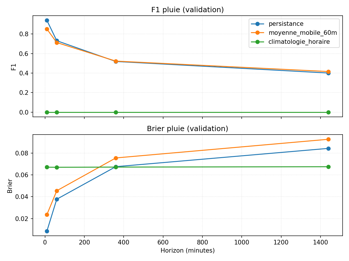 Sur la figure pluie, la persistance profite à plein de la rareté des événements : annoncer “sec” presque tout le temps donne un F1 très élevé aux petits horizons, même si le Brier score se dégrade en s’éloignant. La climatologie horaire, sans contexte, ne voit pratiquement jamais la pluie. Toute tentative de modèle devra donc battre la persistance sur F1/Brier, surtout à +60 et +360 minutes où le score chute déjà : la barre n’est pas très haute en absolu, mais elle l’est par rapport à la quantité d’information disponible dans une simple série locale.