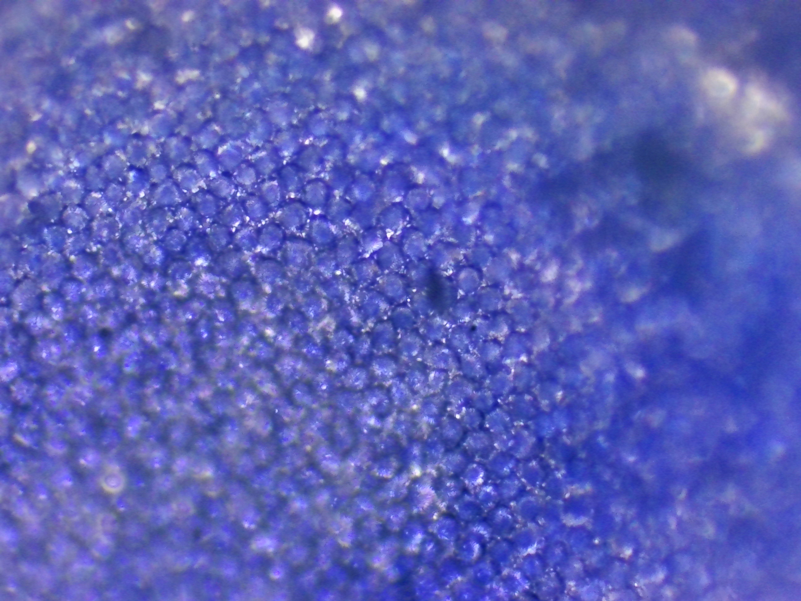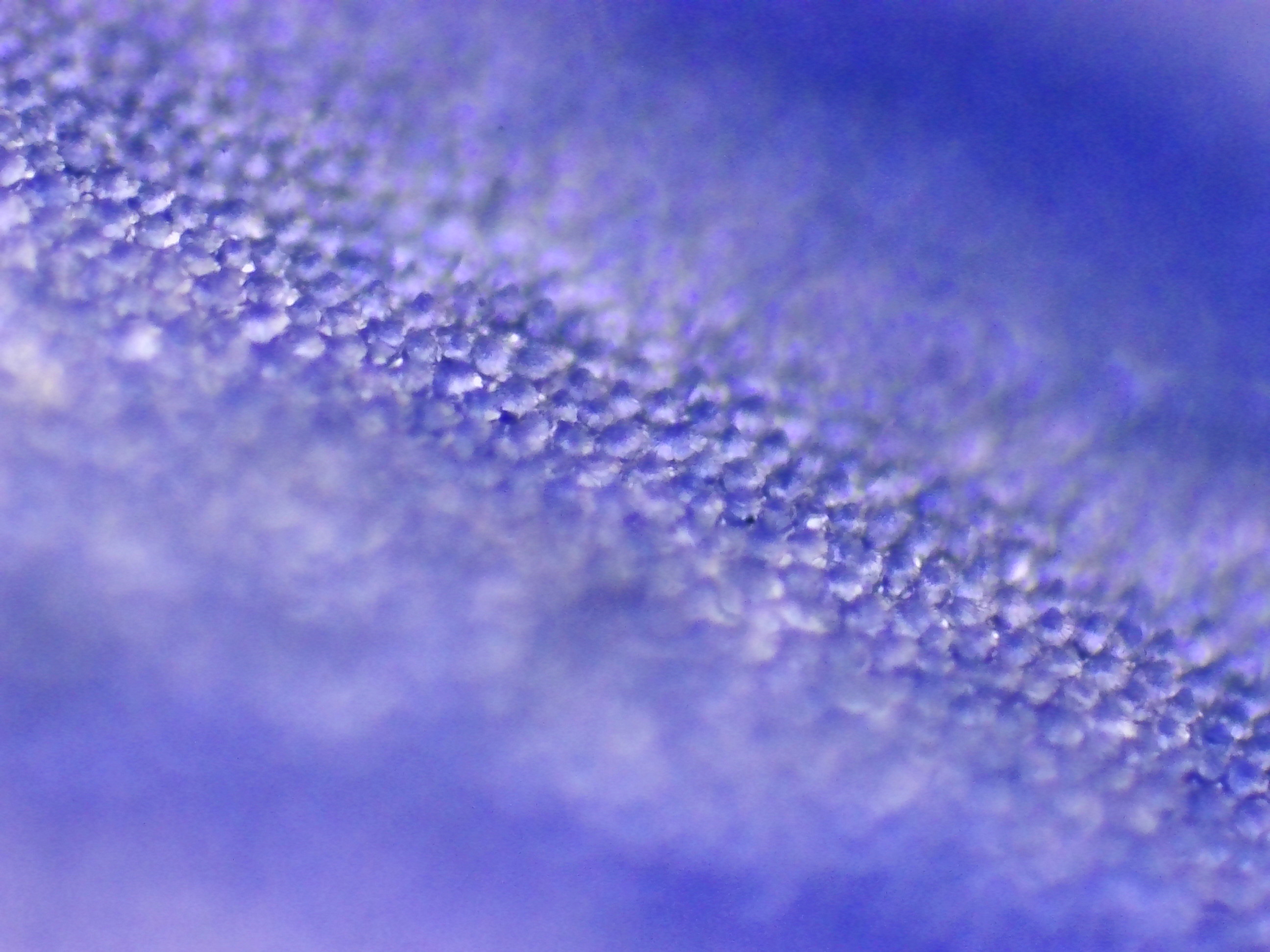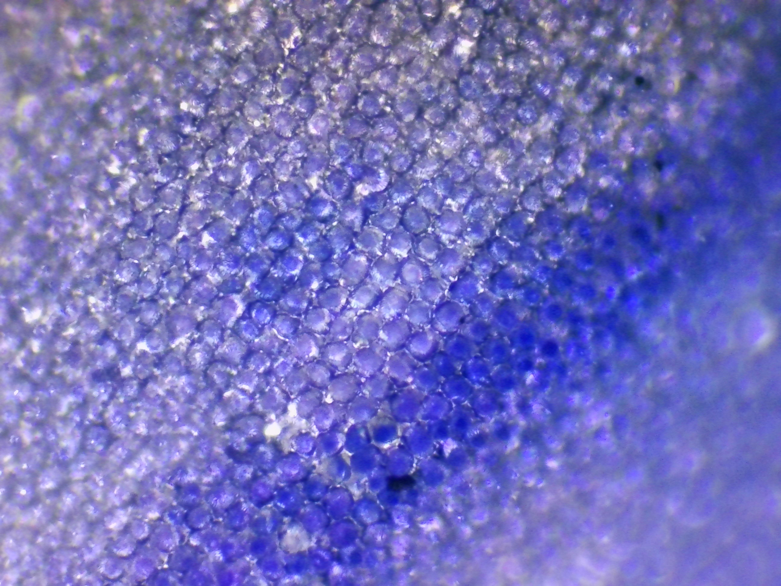Sur ces deux photos, j'ai cherché à mettre en évidence des changements dans la pigmentation du pétale. On voit clairement ici la forte amplitude de concentration en pigments d'une cellule à l'autre, alors même qu'elles sont voisines : certaines sont presque transparentes, tandis que les autres peuvent être d'un bleu particulièrement profond.
