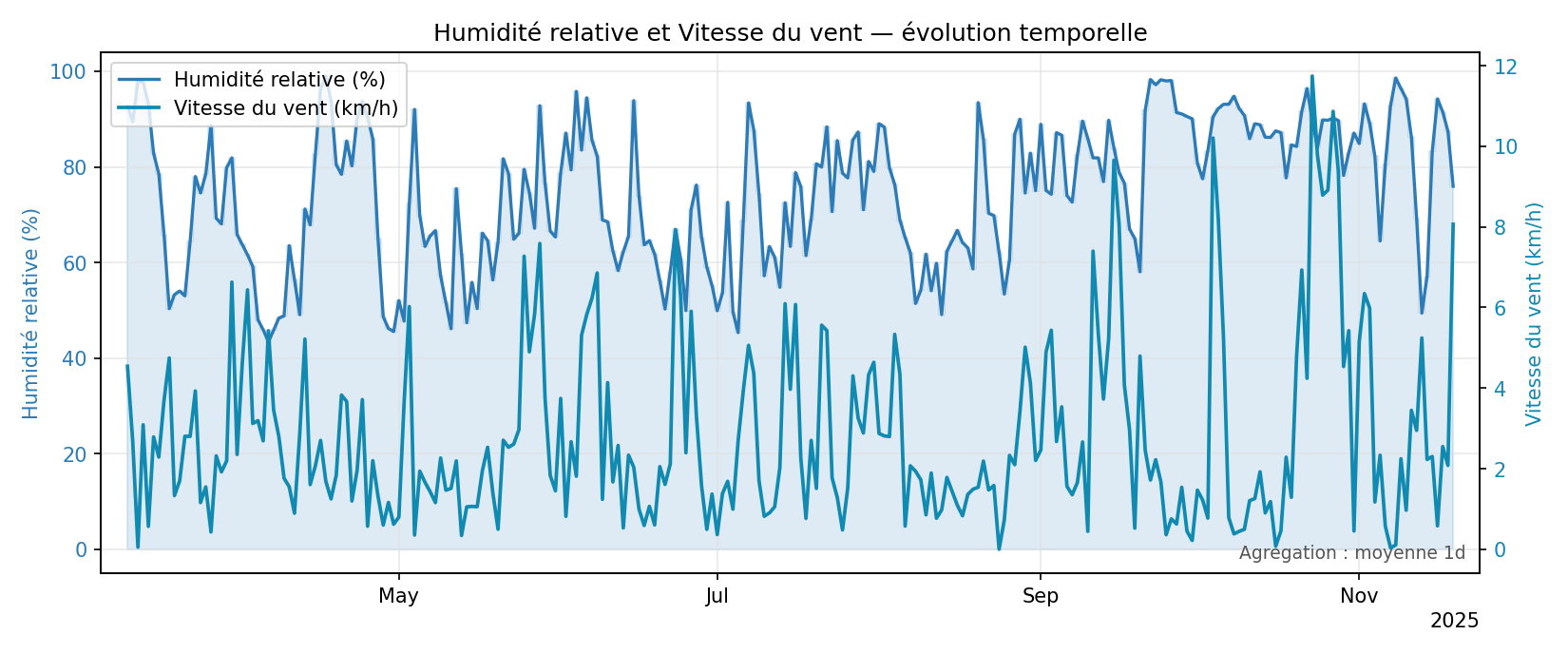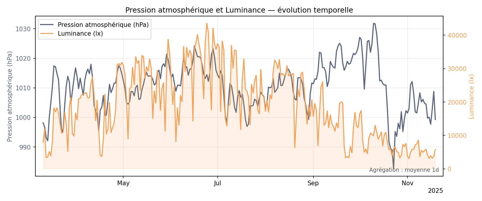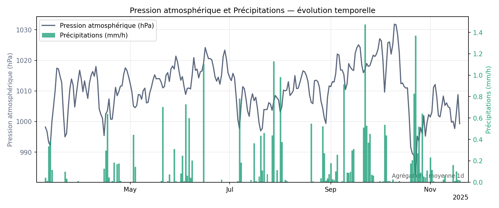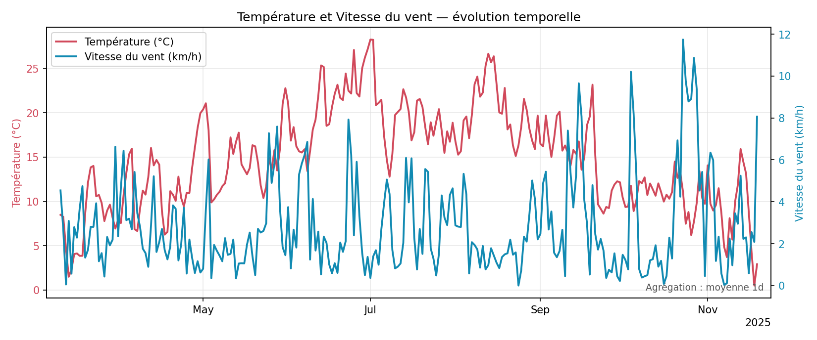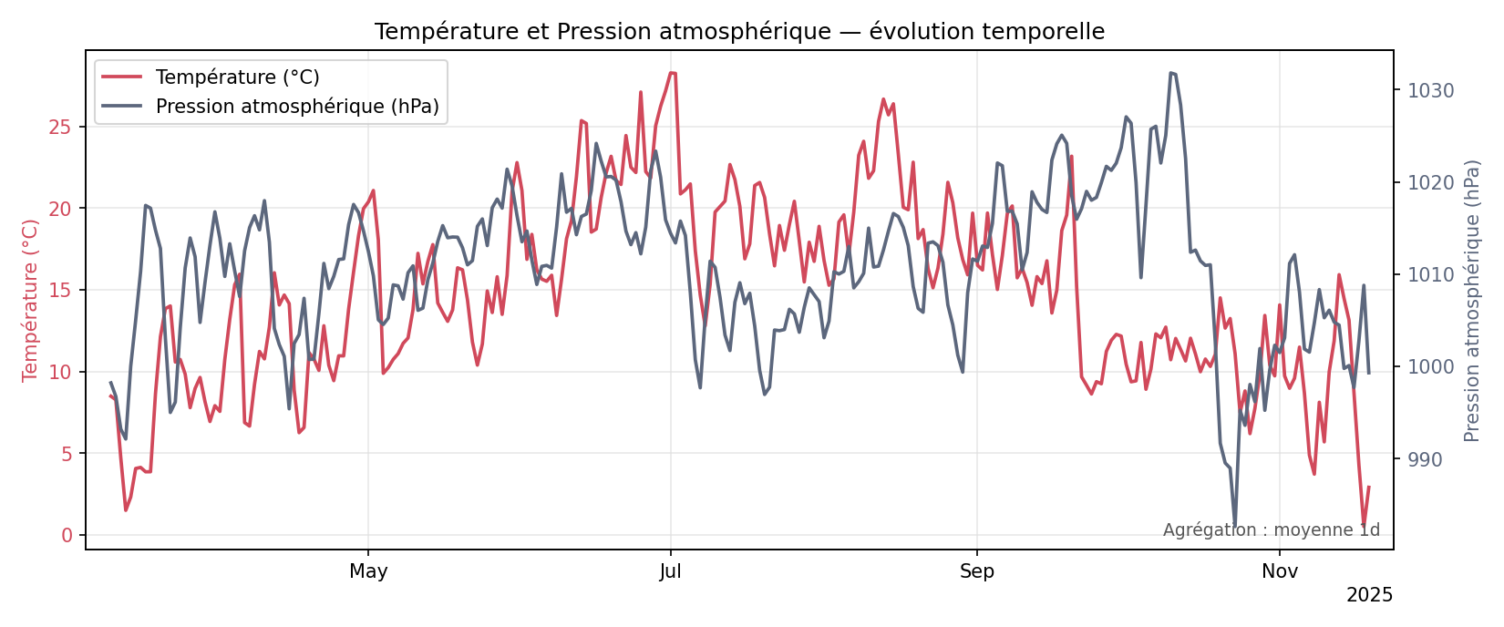 Le signe et l'intensité des coefficients montrent à quel point deux variables bougent ensemble au même instant (co-mouvement linéaire pour Pearson, monotone pour Spearman). Cette matrice sert donc surtout de carte globale : repérer rapidement les couples très corrélés ou indiquer un lien physique évident, mettre en alerte des variables à forte corrélation qui pourraient masquer d'autres effets (saisonnalité, cycle jour/nuit), et choisir quelles paires méritent qu'on teste des décalages temporels ou des relations non linéaires dans la suite.