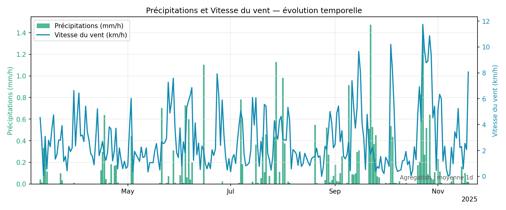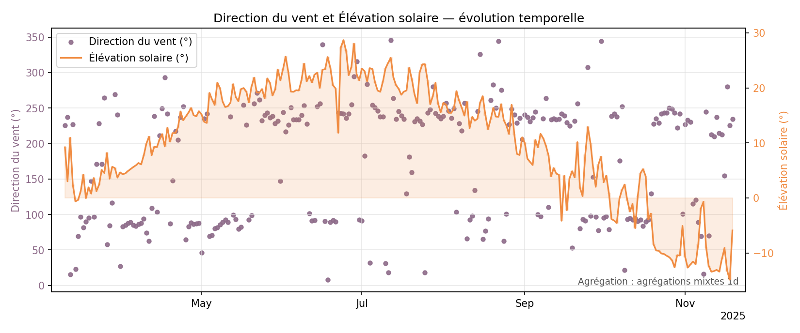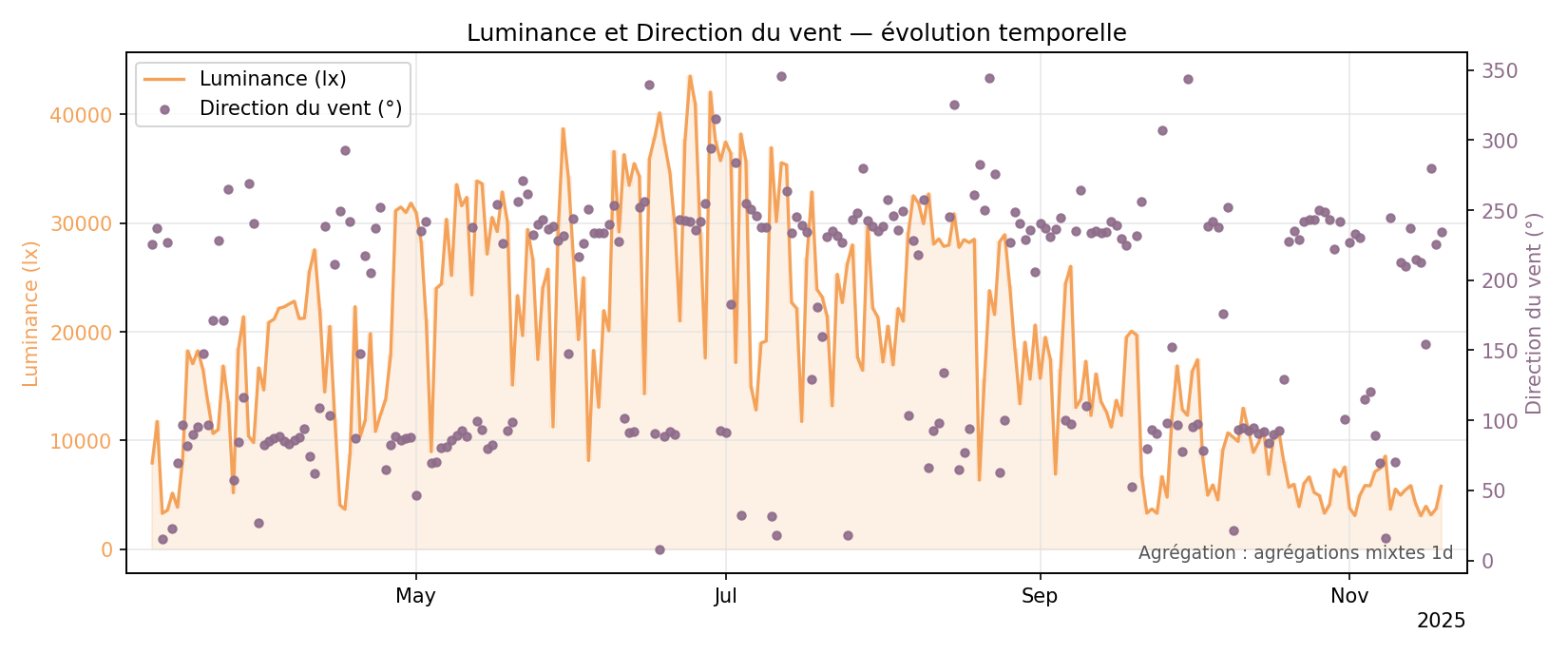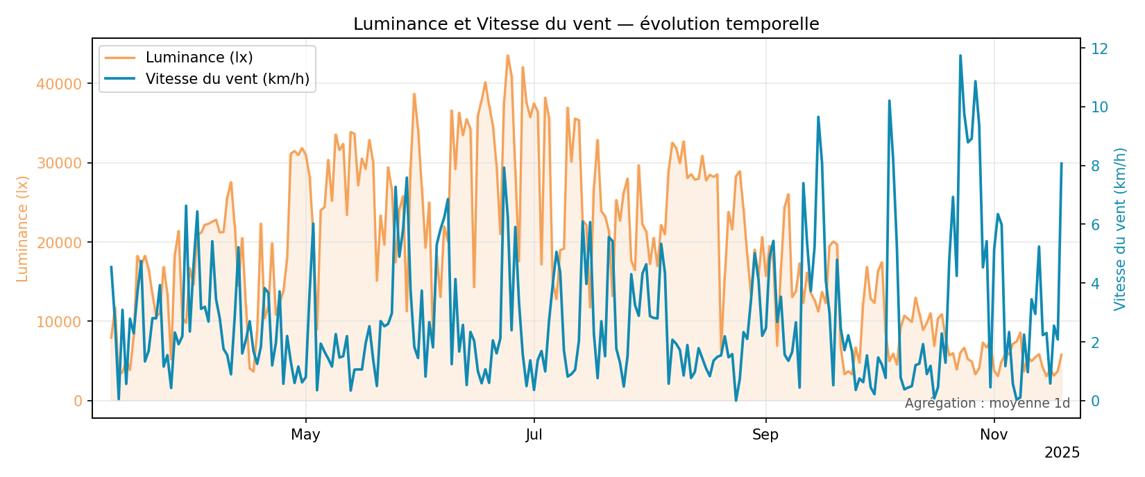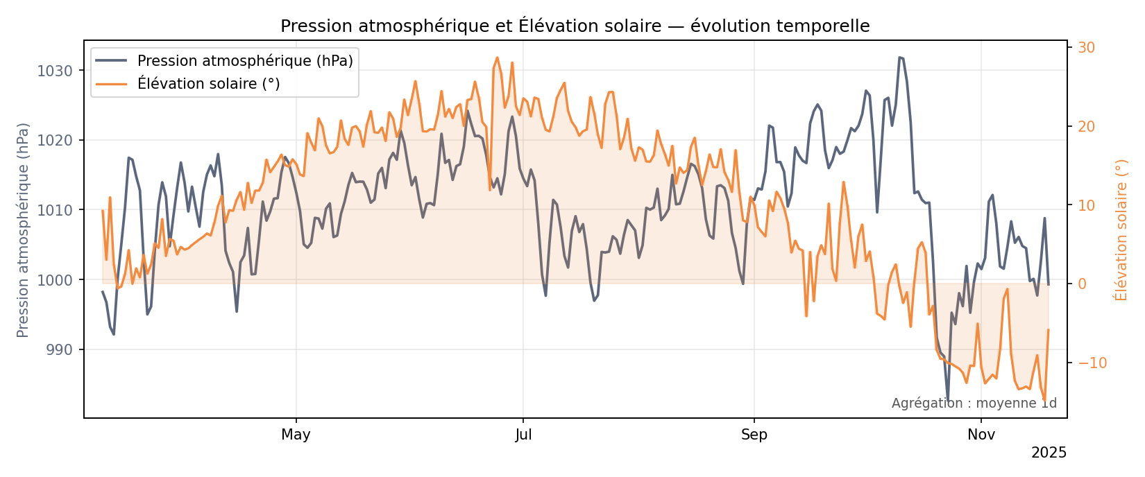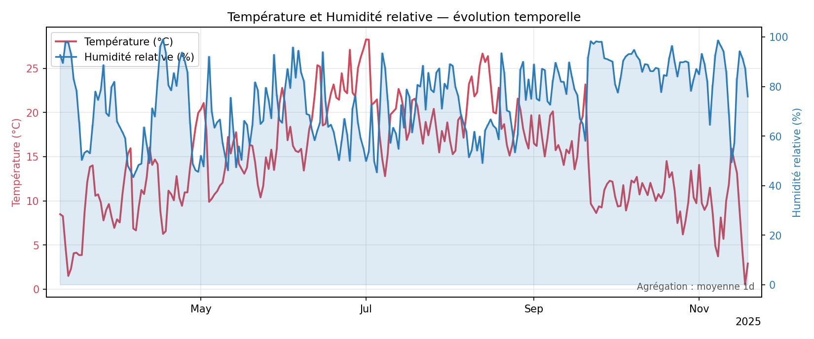 Le signe et l'intensité des coefficients montrent à quel point deux variables bougent ensemble au même instant (co-mouvement linéaire pour Pearson, monotone pour Spearman). Cette matrice sert donc surtout de carte globale : repérer rapidement les couples très corrélés ou indiquer un lien physique évident, mettre en alerte des variables à forte corrélation qui pourraient masquer d'autres effets (saisonnalité, cycle jour/nuit), et choisir quelles paires méritent qu'on teste des décalages temporels ou des relations non linéaires dans la suite.