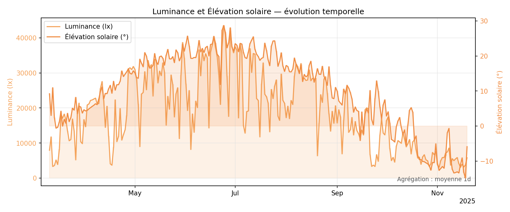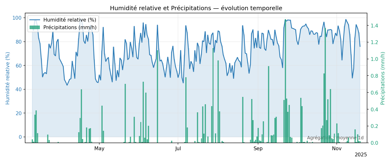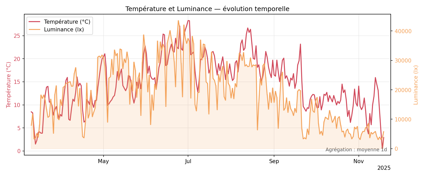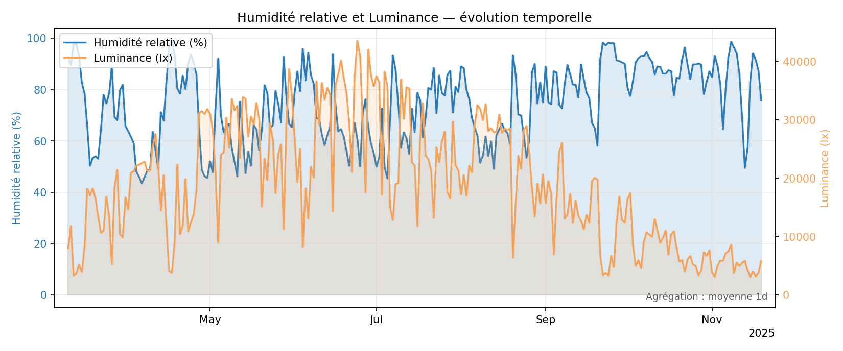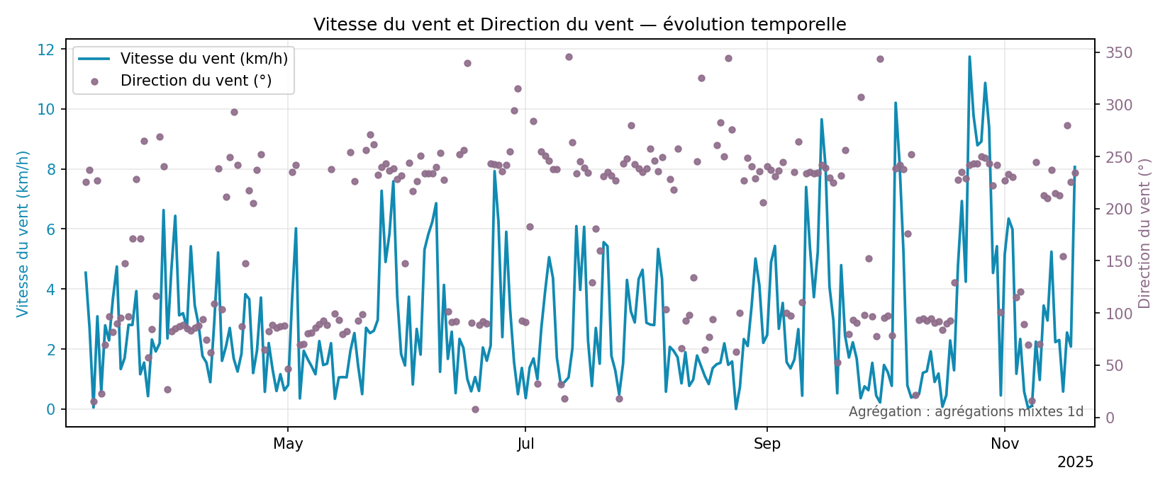 Le signe et l'intensité des coefficients montrent à quel point deux variables bougent ensemble au même instant (co-mouvement linéaire pour Pearson, monotone pour Spearman). Cette matrice sert donc surtout de carte globale : repérer rapidement les couples très corrélés ou indiquer un lien physique évident, mettre en alerte des variables à forte corrélation qui pourraient masquer d'autres effets (saisonnalité, cycle jour/nuit), et choisir quelles paires méritent qu'on teste des décalages temporels ou des relations non linéaires dans la suite.