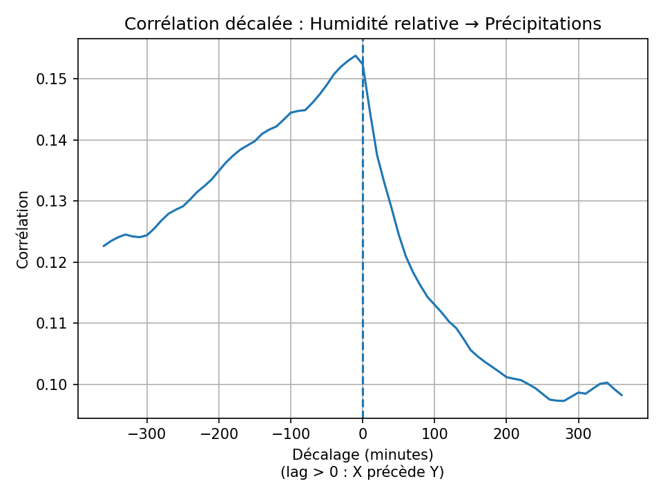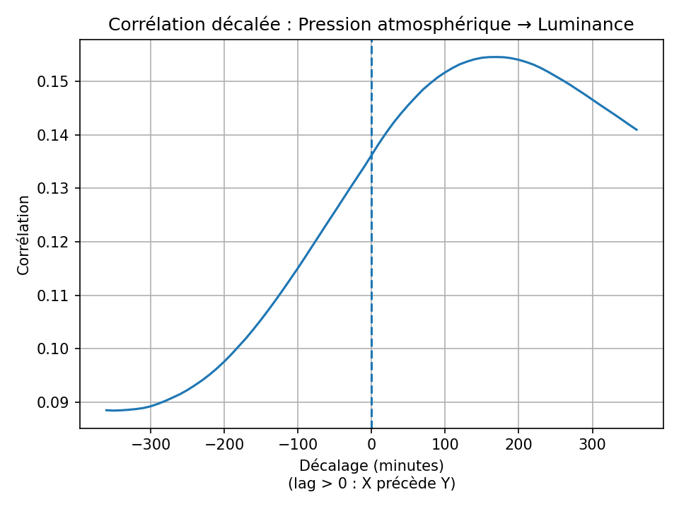 Ainsi, il est clair qu'il existe une corrélation forte et immédiate entre la température et l'humidité relative. La corrélation entre température et luminance est également forte, mais elle est décalée : le pic de luminance précède le pic de température de près de deux heures.