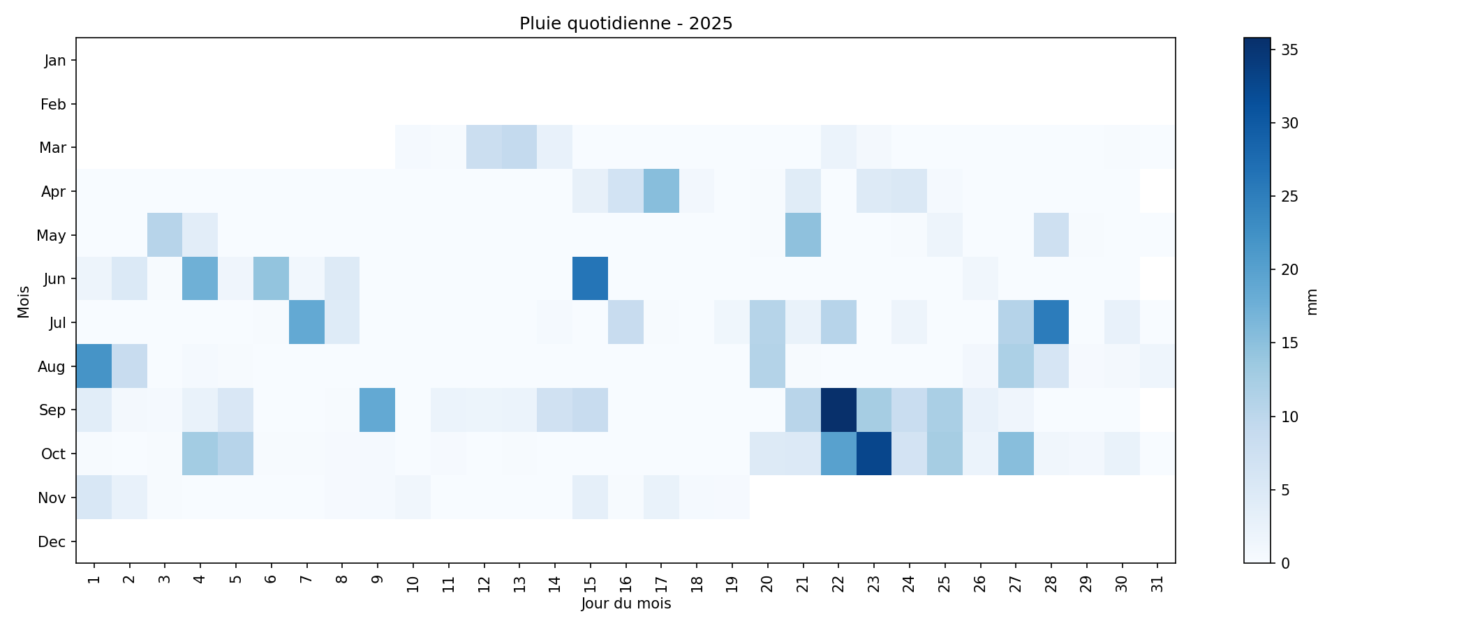 Les vues calendrier permettent de visualiser, jour par jour, les cumuls ou moyennes quotidiennes sur la dernière année complète disponible.