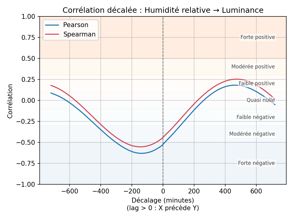 Ainsi, il est clair qu'il existe une corrélation forte et immédiate entre la température et l'humidité relative. La corrélation entre température et luminance est également forte, mais elle est décalée : le pic de luminance précède le pic de température de près de deux heures.