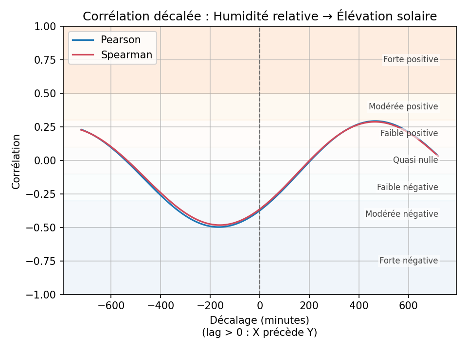 Comme ces deux corrélations sont fortes, on en déduit que l'on devrait logiquement observer une corrélation forte et décalée entre la luminance et l'humidité relative (et c'est bien le cas, comme en témoigne le graphique correspondant). Un rapport similaire, quoique moins prononcé, existe entre la température, l'humidité relative et l'élévation solaire, puisque la luminance en dépend directement.
