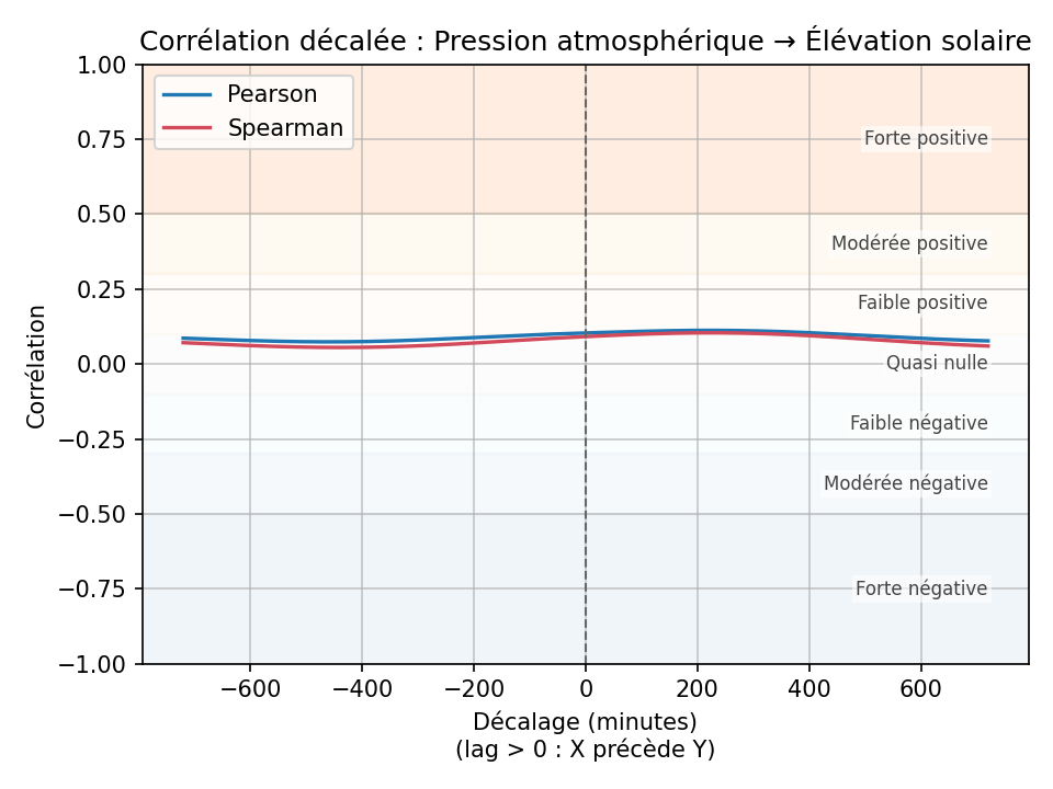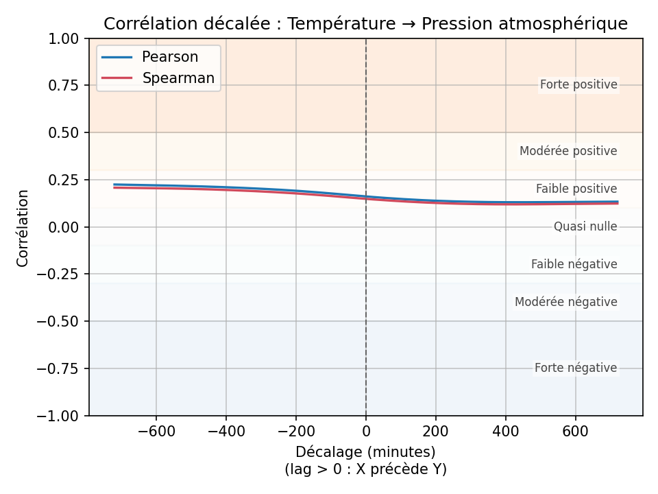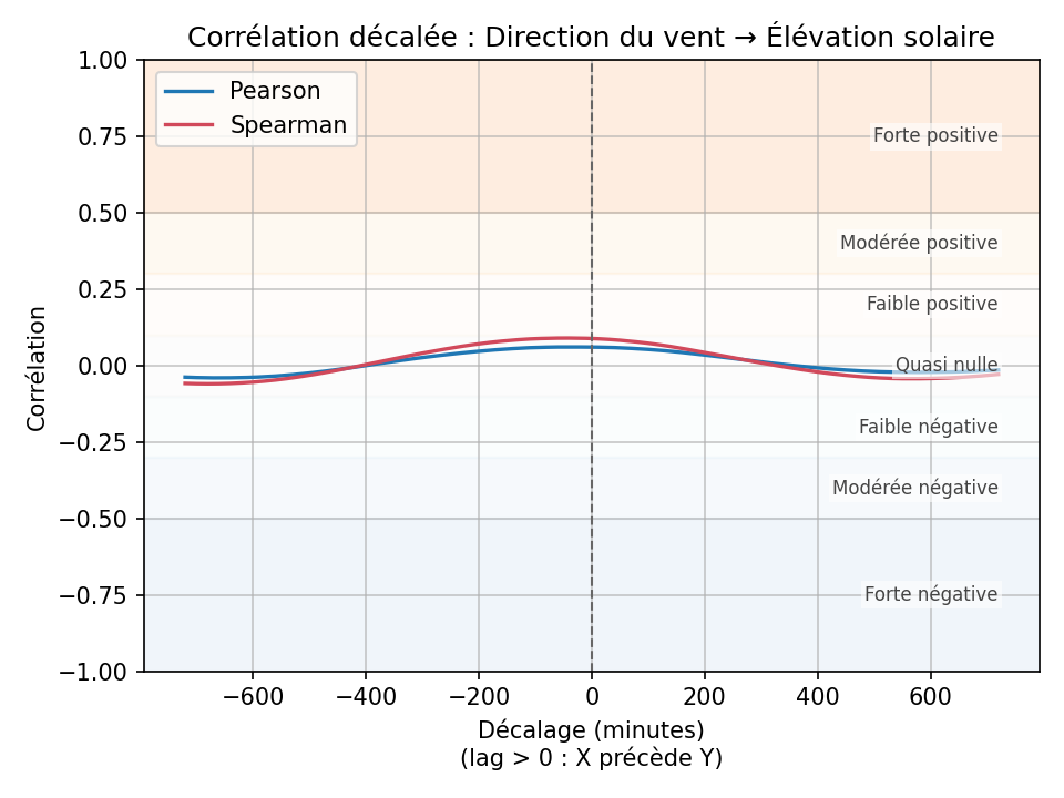 Il est important de souligner que ces décalages ne sont pas transitifs. Chaque case correspond au décalage qui maximise la corrélation X→Y calculée directement sur les deux signaux ; on nobtient pas un « décalage absolu » que lon pourrait soustraire ou additionner via une troisième variable. Deux couples peuvent avoir des pics de corrélation à des lags voisins ou différents selon la forme du signal, le bruit, linertie physique ou la résolution (pas de 10 minutes). Pour connaître le décalage entre deux variables, il faut donc regarder leur case spécifique dans la matrice : on ne peut pas l'inférer des relations entre trois variables.