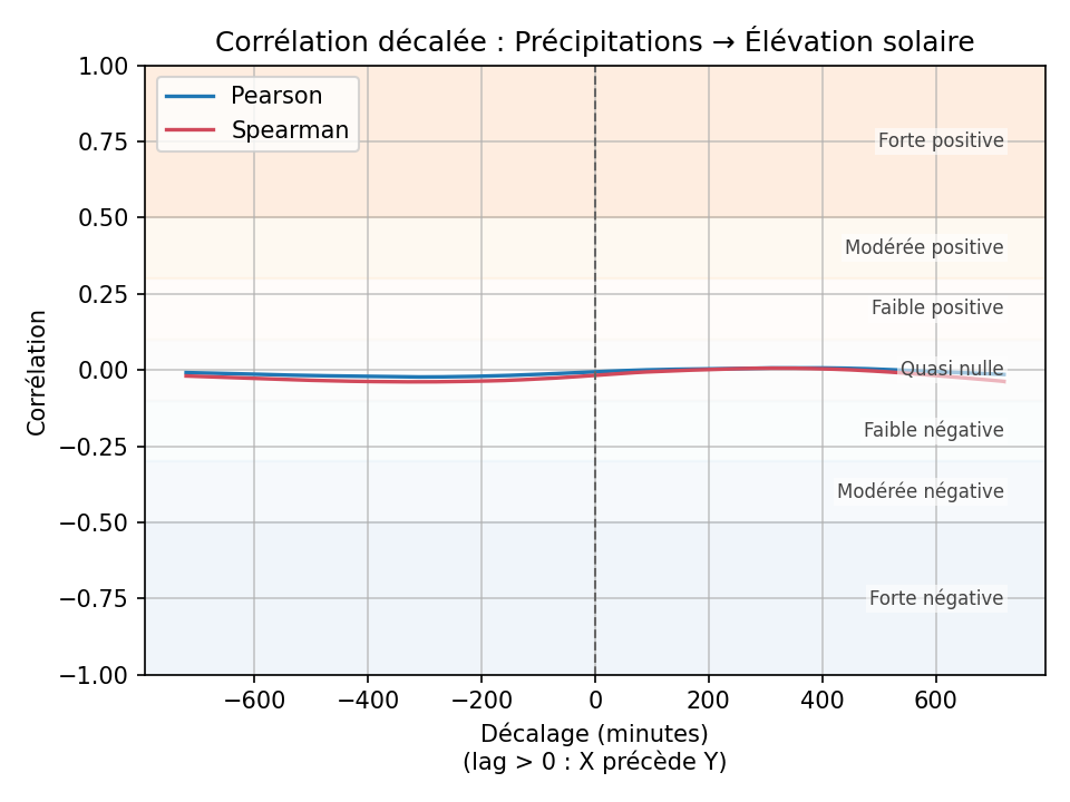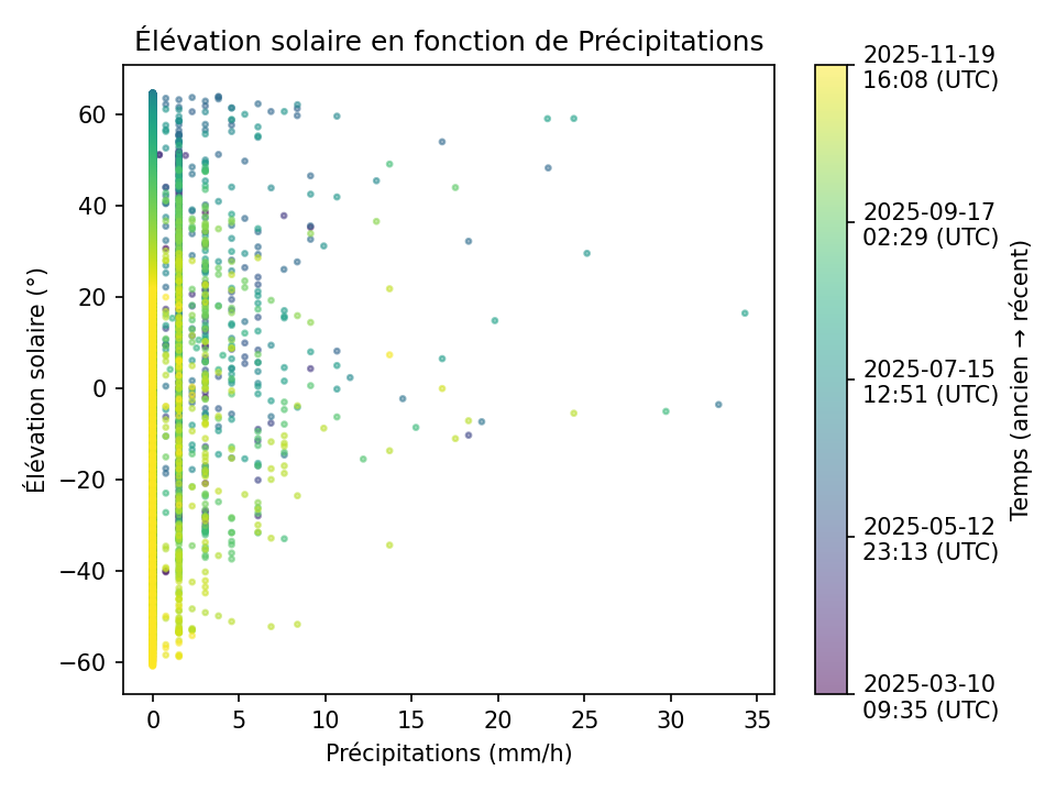 Pas de corrélation avec l'élévation solaire (r ~ 0) : les épisodes pluvieux, rares, sont répartis sur le jour et la nuit. Les fréquences de pluie varient peu selon lélévation (≈34,5 % des points), avec un léger surplus aux basses élévations mais sans tendance nette matin/après-midi.