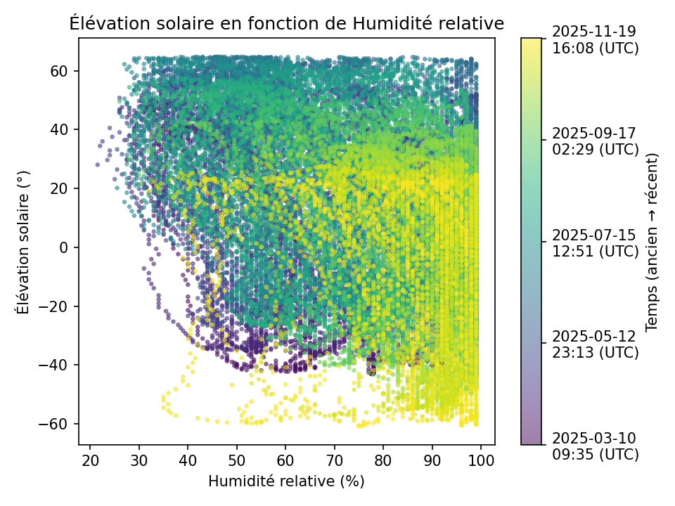 L'humidité diminue quand l'élévation solaire augmente (r ~ -0,37), mais la dispersion reste forte, surtout aux basses élévations.