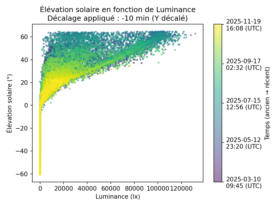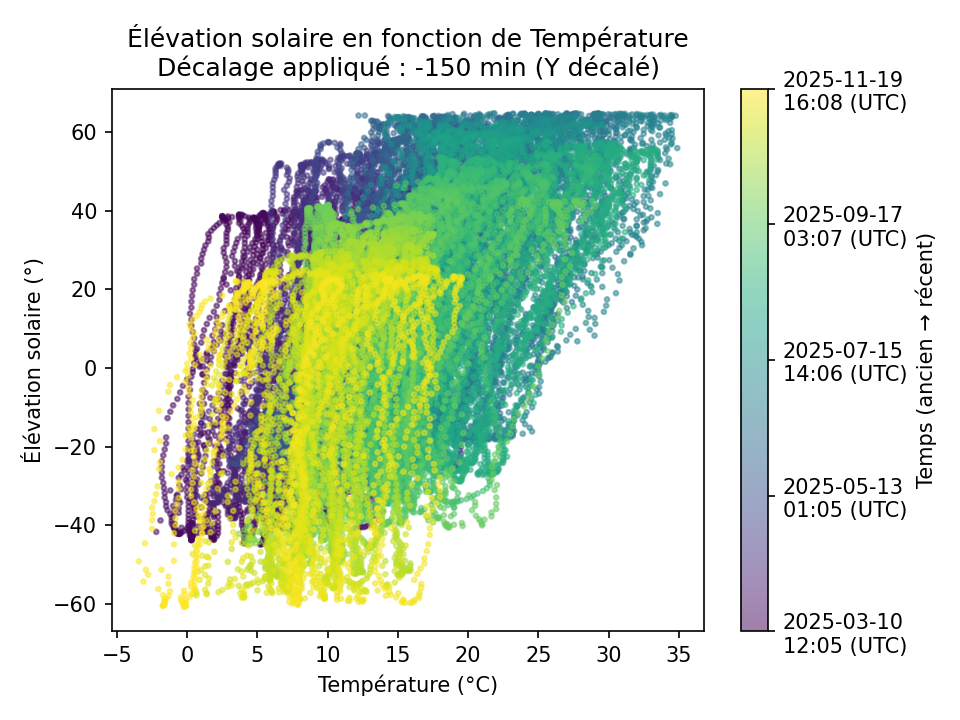 Sans décalage, lélévation solaire et la température montent ensemble (r ~ 0,47), mais le nuage dessine un « 8 » : pour une même élévation modérée, la branche du matin est nettement plus froide que celle du soir, et la coloration temporelle montre que les périodes récentes (été) maintiennent des températures élevées jusquà des élévations plus faibles.