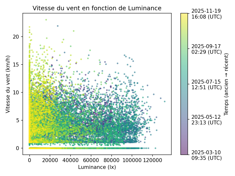 Luminance élevée coïncide légèrement avec des vents un peu plus rapides (r ~ 0,13), mais la plupart des observations restent proches du calme quelle que soit la lumière.