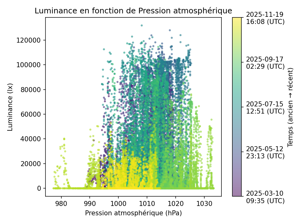 Faible tendance (r ~ 0,14) à associer les hautes pressions aux périodes lumineuses ; la variance reste importante, y compris de nuit. Seul un point atteint ~40 k lux sous ~981 hPa, isolé et insuffisant pour inférer un motif.