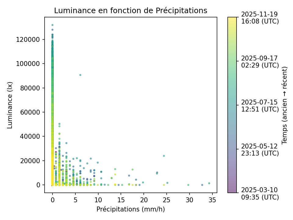 Comme 96 % des valeurs sont nulles, aucune tendance nette ; les rares précipitations surviennent surtout lorsque la luminance est faible.