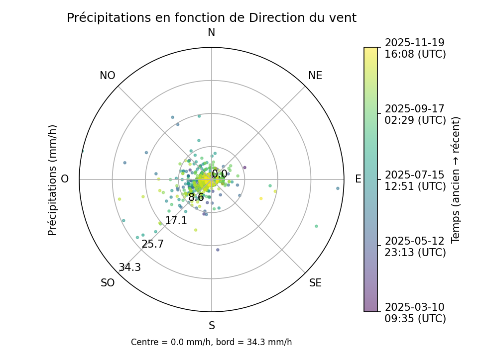 Précipitations plus présentes avec des vents d'Ouest à Nord-Ouest (~0,2 mm/h en moyenne sur ces secteurs) que sous flux d'Est/NE, mais le signal reste faible car la plupart des pas de temps sont secs.