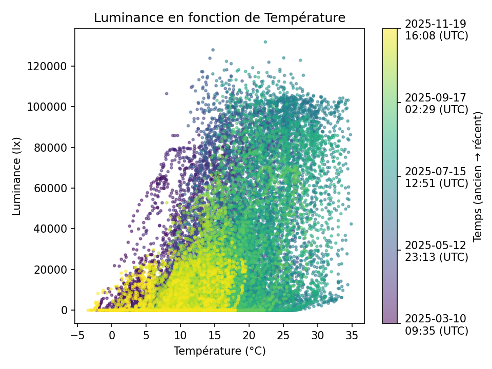 Sans lag, la luminance croît globalement avec la température (r ~ 0,51), mais le nuage reste étalé avec un gros paquet nocturne à luminance nulle sur une large plage de températures ; la coloration temporelle montre aussi que les points récents (été) concentrent les températures les plus élevées pour une même luminance.
