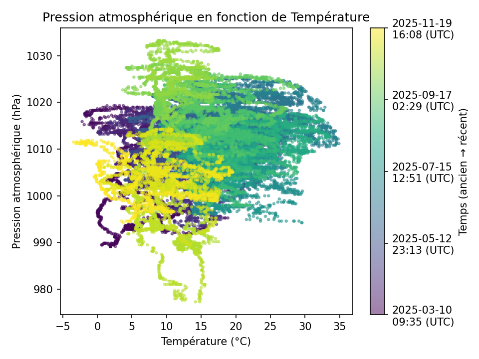 Léger biais positif (r ~ 0,16) : la pression reste cantonnée entre 1005 et 1025 hPa tandis que la température oscille largement autour, formant des bandes verticales qui sélargissent dans le temps (couleurs plus récentes), signe que la montée saisonnière des températures se superpose à une pression quasi stable.