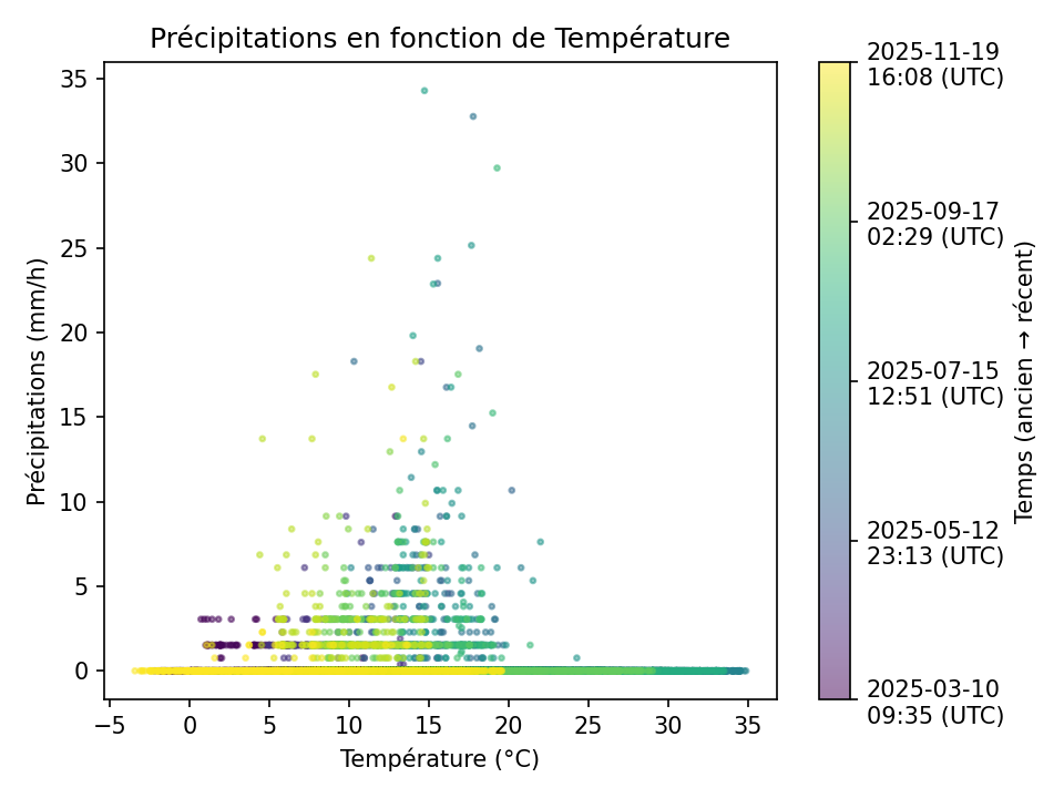 96 % des mesures sont sans pluie ; les 1242 averses recensées se situent entre 0,7 °C et 24,3 °C, aucune au-delà de 25 °C ni sous 0 °C. Les données couvrant mars→novembre, il manque encore un hiver complet pour conclure sur les très basses températures.