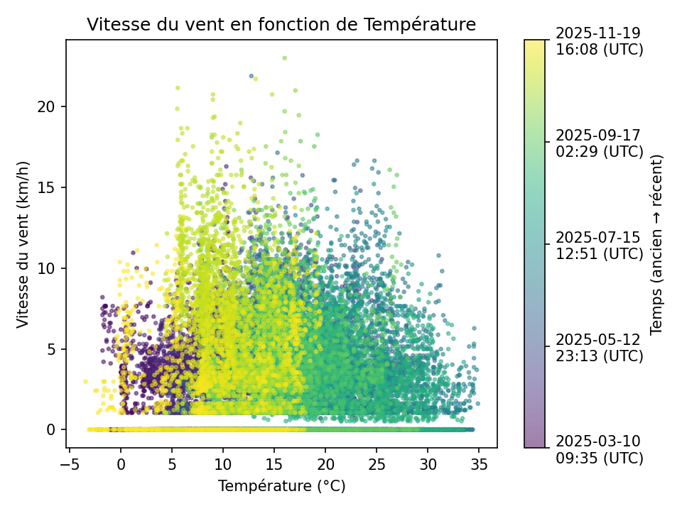 Pas de tendance discernable entre température et vitesse du vent ; la plupart des vitesses restent faibles (médiane ~2,4 km/h) quel que soit le niveau thermique.