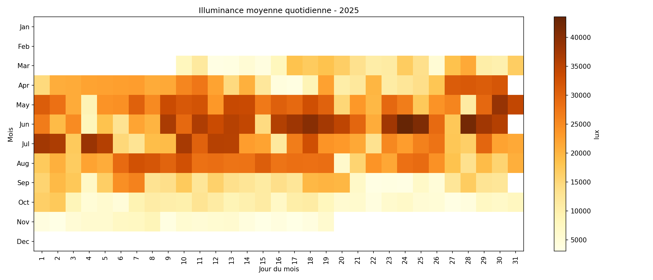 Les vues calendrier permettent de visualiser, jour par jour, les cumuls ou moyennes quotidiennes sur la dernière année complète disponible. Les images générées sont stockées dans figures/calendar/ et les CSV correspondants dans data/calendar/.