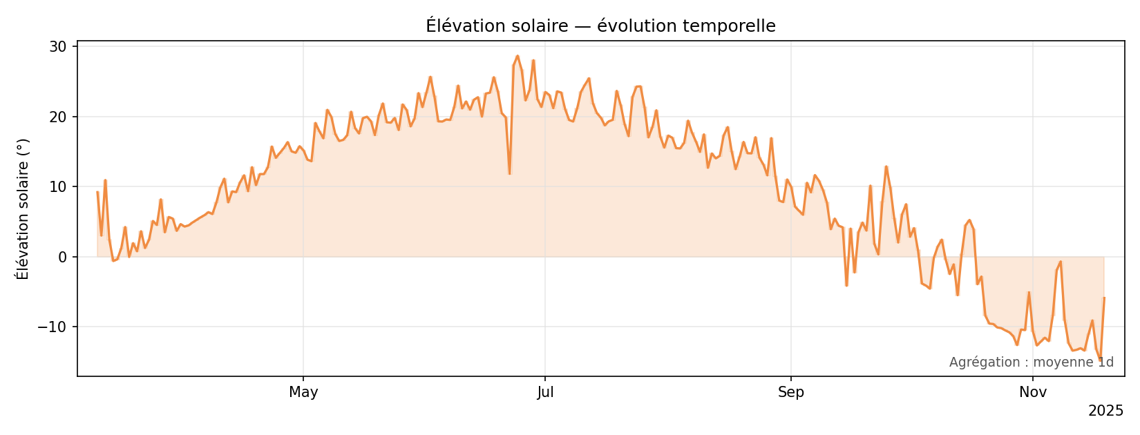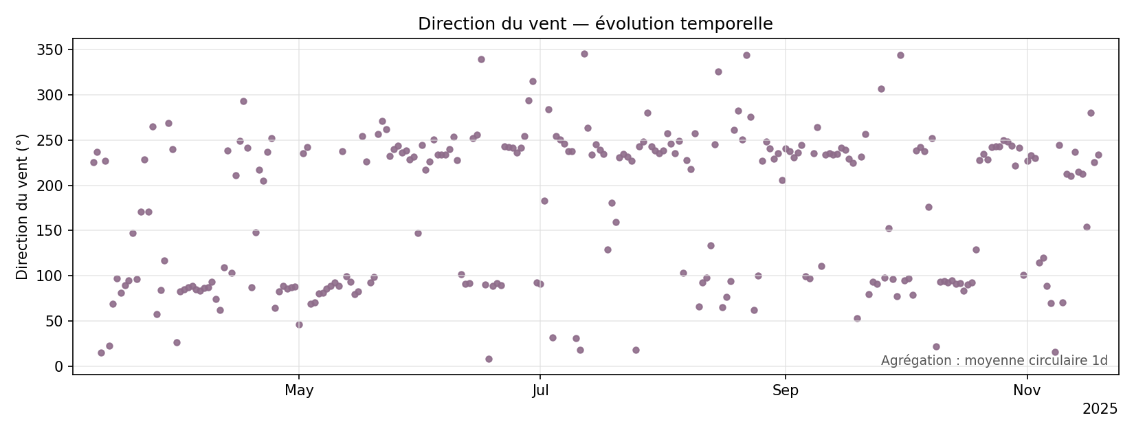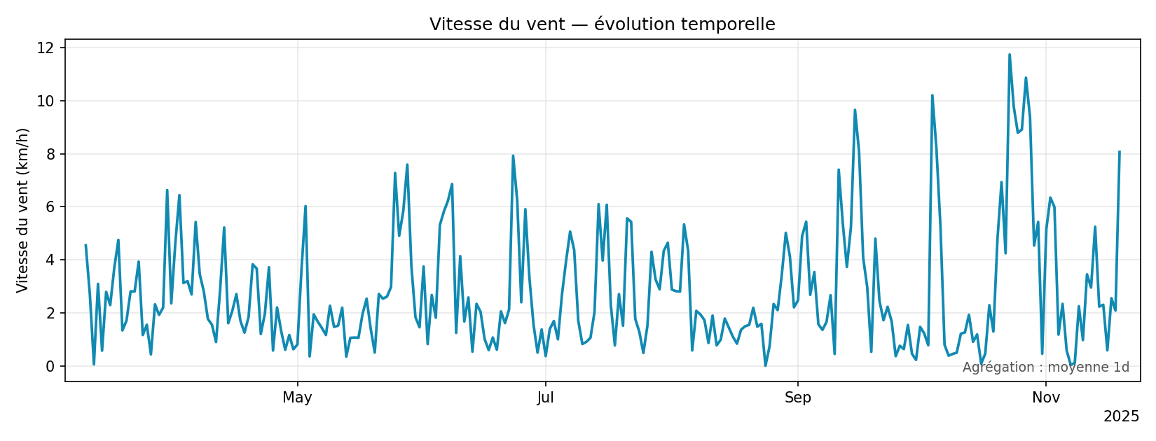 Les graphiques couvrent maintenant toute la période disponible dans data/weather_minutely.csv. Une agrégation automatique réduit le nombre de points pour rester lisible (plus de courbes "peignes"), et l'axe des dates utilise un format compact qui évite tout chevauchement de labels. On peut au besoin restreindre la période avec --days ou imposer une fréquence d'agrégation avec --resample.